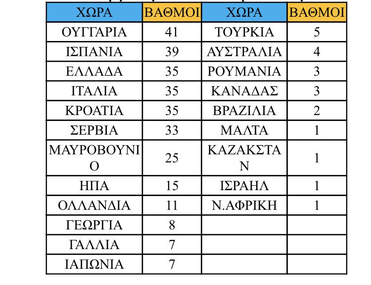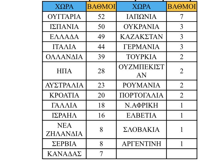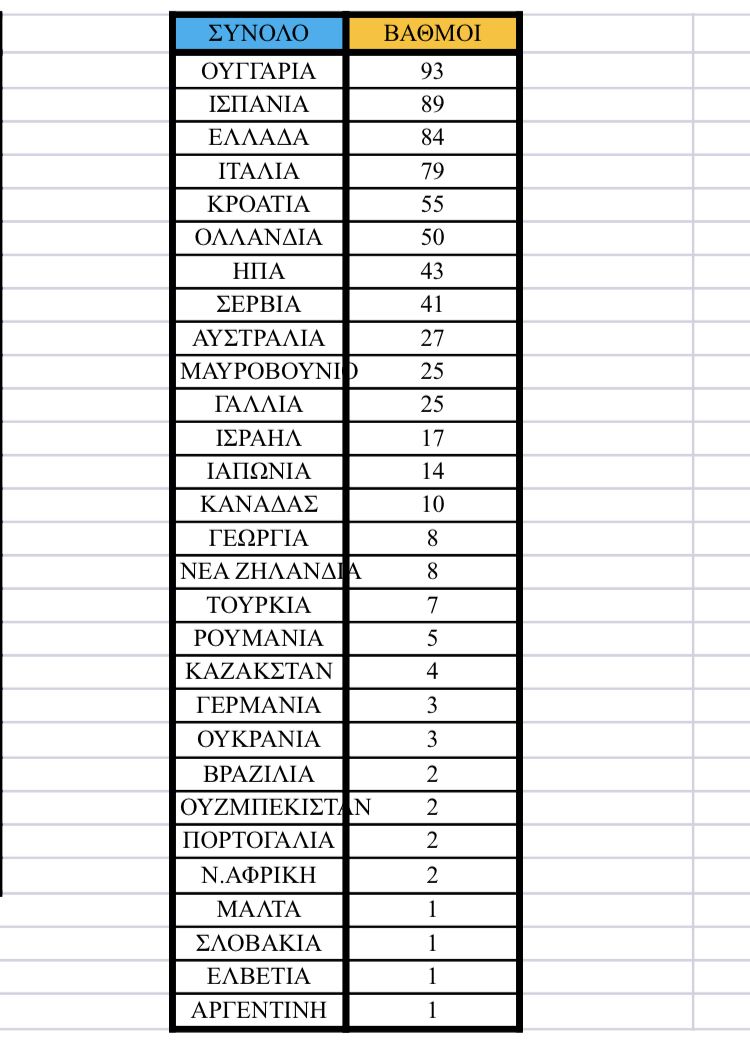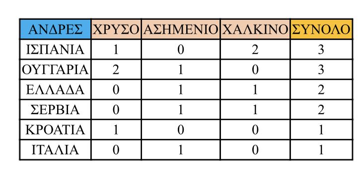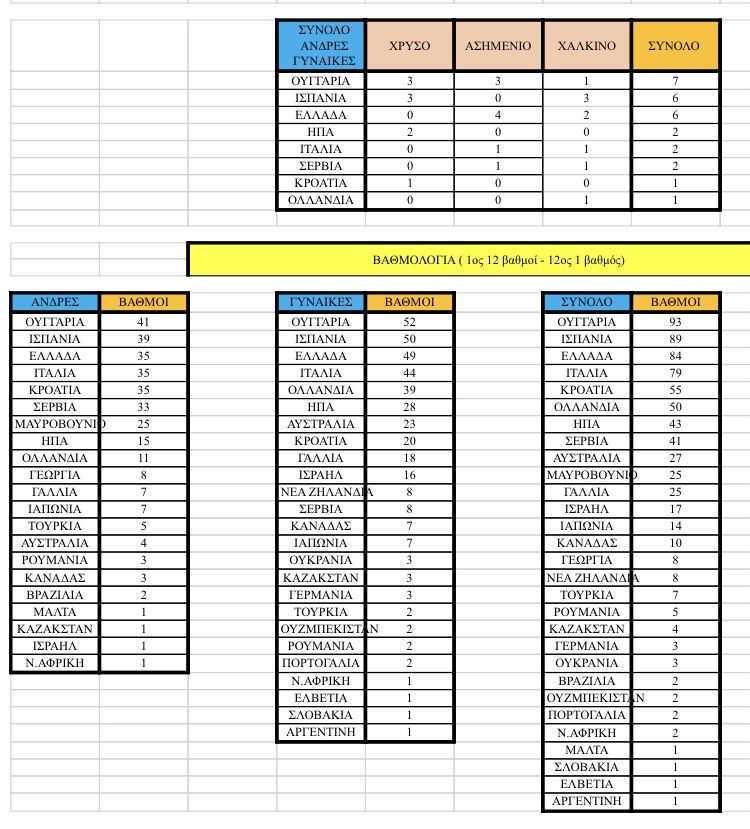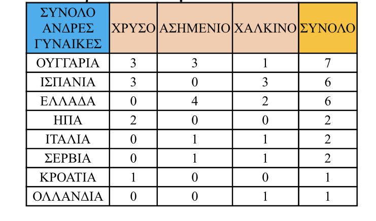 • Τέλος στο σύνολο στις 9 διοργανώσεις που έχουν γίνει ανδρών και γυναικών είναι λογικό να μην βλέπουμε διαφορές. Τους πιο πολλούς βαθμούς στο σύνολο έχει η Ουγγαρία με 93, ακολουθεί η Ισπανία με 89, η Ελλάδα με 84, η Ιταλία με 79, η Κροατία με 55, η Ολλανδία με 50, η ΗΠΑ με 43 και η Σερβία με 41.