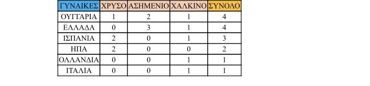 • Στις γυναίκες τους πιο πολλούς βαθμούς ( 52 ) τους έχει πάλι η Ουγγαρία, ακολουθεί η Ισπανία με 50, η Ελλάδα με 49, η Ιταλία με 44, η Ολλανδία με 39, η ΗΠΑ με 28 και η Αυστραλία με 23