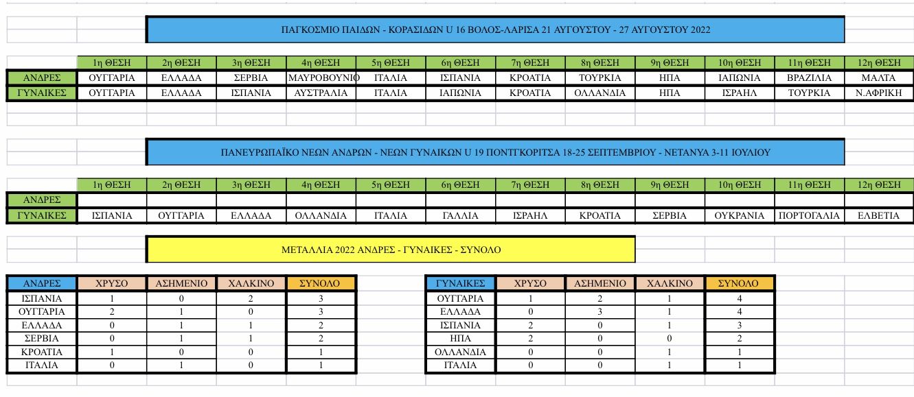 • Τέλος στο σύνολο στις 9 διοργανώσεις ανδρών και γυναικών που έχουν γίνει μέχρι τώρα το 2022, η Ουγγαρία ( 3-3-1 ) έχει κερδίσει 7 μετάλλια, ακολουθεί η Ισπανία (3-0-3 ) μαζί με την Ελλάδα ( 0-4-2 ) με 6 μετάλλια, η ΗΠΑ ( 2-0-0 ) η Ιταλία ( 0-1-1 ) και η Σερβία ( 0-1-1 ) με 2 μετάλλια και η Κροατία ( 1-0-0 ) με την Ολλανδία ( 0-0-1 ) που κέρδισαν ένα μετάλλιο.