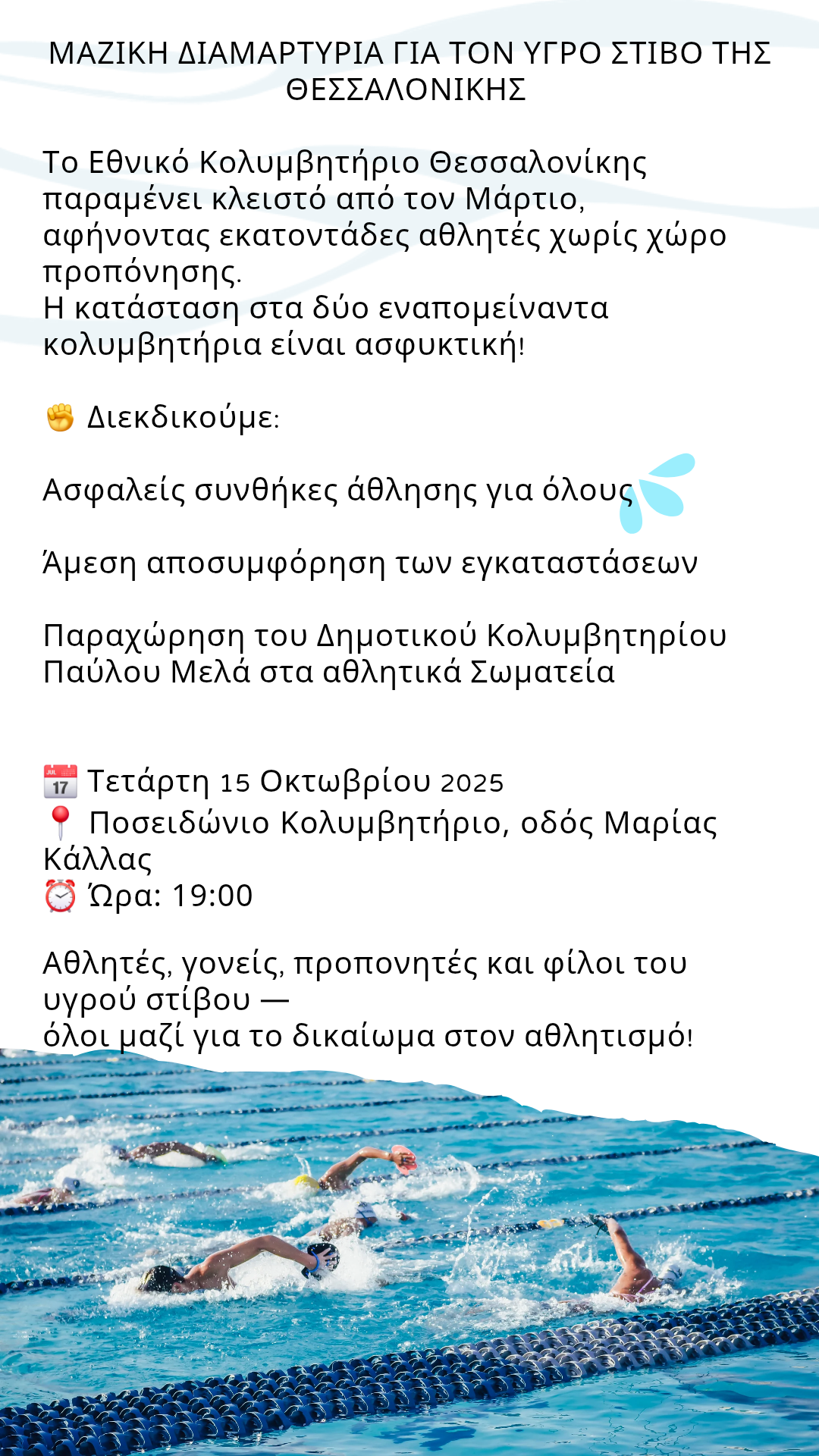 Η Θεσσαλονίκη απαιτεί λύση τώρα! Για περισσότερες πληροφορίες / δηλώσεις: Συντονιστική Επιτροπή Γονέων Αθλητών Υγρού Στίβου (6985084878, evachatzidimou@gmail.com)
