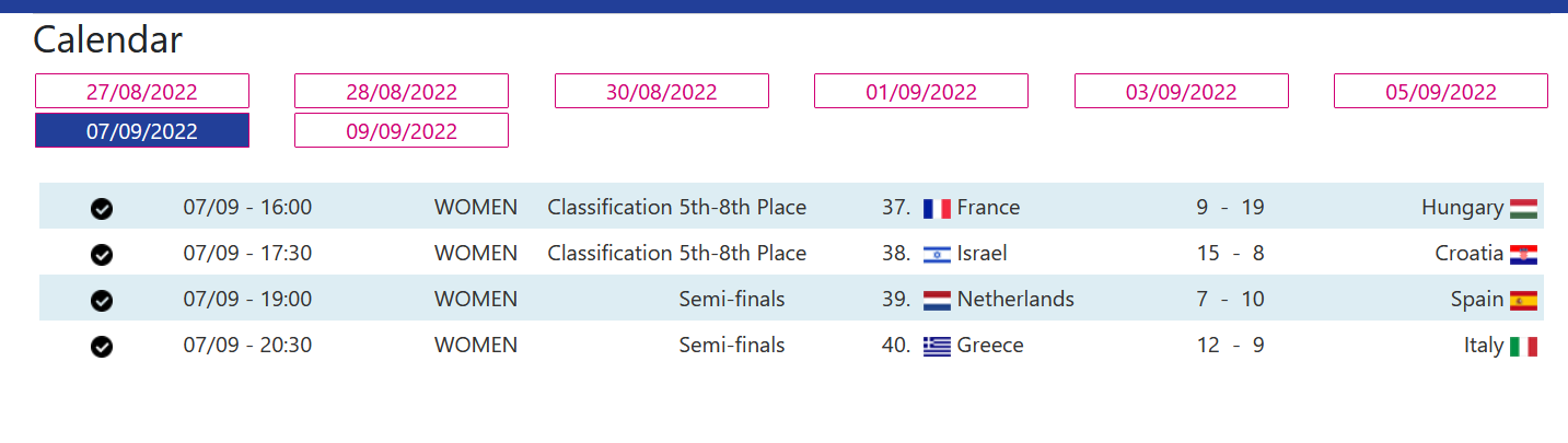 Για τις θέσεις 5-8, η Ουγγαρία νίκησε με 19-9 τη Γαλλία ενώ το Ισραήλ επικράτησε της Κροατίας με 15-8.