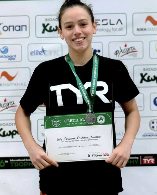 Έχει συμμετάσχει σε μεγάλες διοργανώσεις όπως στο Πανευρωπαϊκό περωτάθλημα Open water (Setubal Portugal), στο Comen Cup (OW – Λάρνακα Κύπρου),  στο Multination youth (Λεμεσό – Κύπρος) και στο  Olympic Youth Festival (Banska bystrica – Slovakia) στα αγωνίσματα του Ελευθέρου, της Πεταλούδας και της Μικτής Ατομικής.