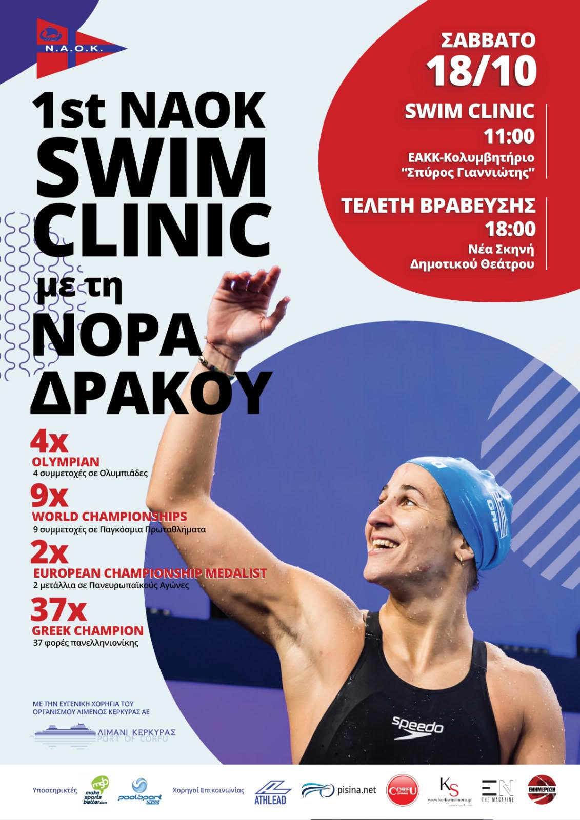 Το κολυμβητικό τμήμα του Ν.Α.Ο.Κ., συνεπές στην προσπάθεια των τελευταίων χρόνων να επανέλθει στο επίπεδο που επιτάσσει η μακρά ιστορία του, πρωτοπορεί για τα τοπικά δεδομένα δίνοντας την ευκαιρία στους κολυμβητές και στις κολυμβήτριες της Κέρκυρας να συναντήσουν, να ακούσουν και να συμβουλευτούν την ελληνίδα κολυμβήτρια που μετρά ήδη 4 συμμετοχές σε Ολυμπιακούς Αγώνες, 9 παρουσίες σε Παγκόσμια Πρωταθλήματα και 2 μετάλλια σε ευρωπαϊκά πρωταθλήματα. Αυτό θα συμβεί το πρωί στις 11 στο κολυμβητήριο “Σπύρος Γιαννιώτης” του Ε.Α.Κ. της Κέρκυρας. Το Swim Clinic είναι μια πρωτοπόρα εκδήλωση ακόμη και για τα δεδομένα της Ελλάδας παρόλο που είναι μια συνήθης πρακτική στο εξωτερικό. Νεαροί αθλητές και αθλήτριες έχουν την ευκαιρία να συναντήσουν τα ινδάλματά τους και να αντλήσουν εμπειρίες και παραστάσεις από αυτούς που βρίσκονται στο υψηλότερο επίπεδο.