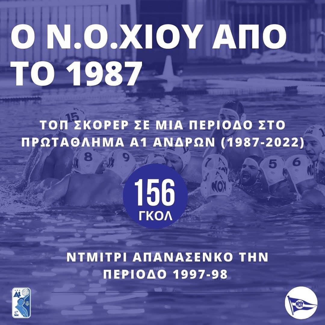 Ο ΝΟ Χίου χρησιμοποιεί στατιστικά στοιχεία για να αναδείξει την παράδοση που διατηρεί στον χώρο της υδατοσφαίρισης και να προσκαλέσει τα νέα παιδιά στην οικογένειά του. Αναδεικνύει το γεγονός ότι το τμήμα υδατοσφαίρισης ανδρών έχει 36 διαδοχικές συμμετοχές στην Α1, με 832 αγώνες και 369 νίκες, ότι ο φοβερός και τρομερός Ντιμίτρι Απανασένκο την χρονιά 1997-98 σημείωσε 156 γκολ στο πρωτάθλημα, αριθμός ρεκόρ στην ιστορία της διοργάνωσης και ότι ο ίδιος σούπερ σταρ πέτυχε 22 γκολ σε έναν αγώνα απέναντι στον Πανιώνιο όπου οι Χιώτες είχαν κερδίσει με 27-3!!!