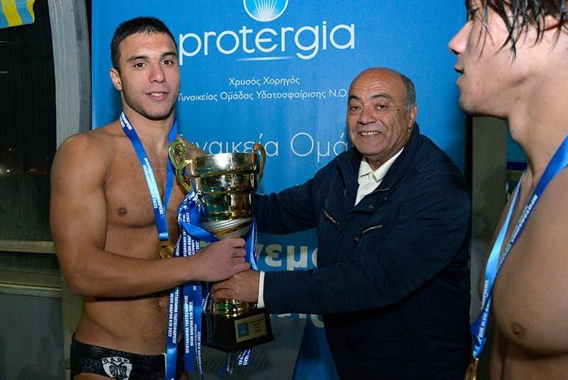 Στην δεύτερη φωτογραφία εικονίζονται οι πρωταθλητές μέσα στο νερό και στην τρίτη ο αρχηγός Βασίλης Ιωσήφ παραλαμβάνει το κύπελλο από τον γενικό γραμματέα της ΚΟΕ κύριο Αυγουλέα.