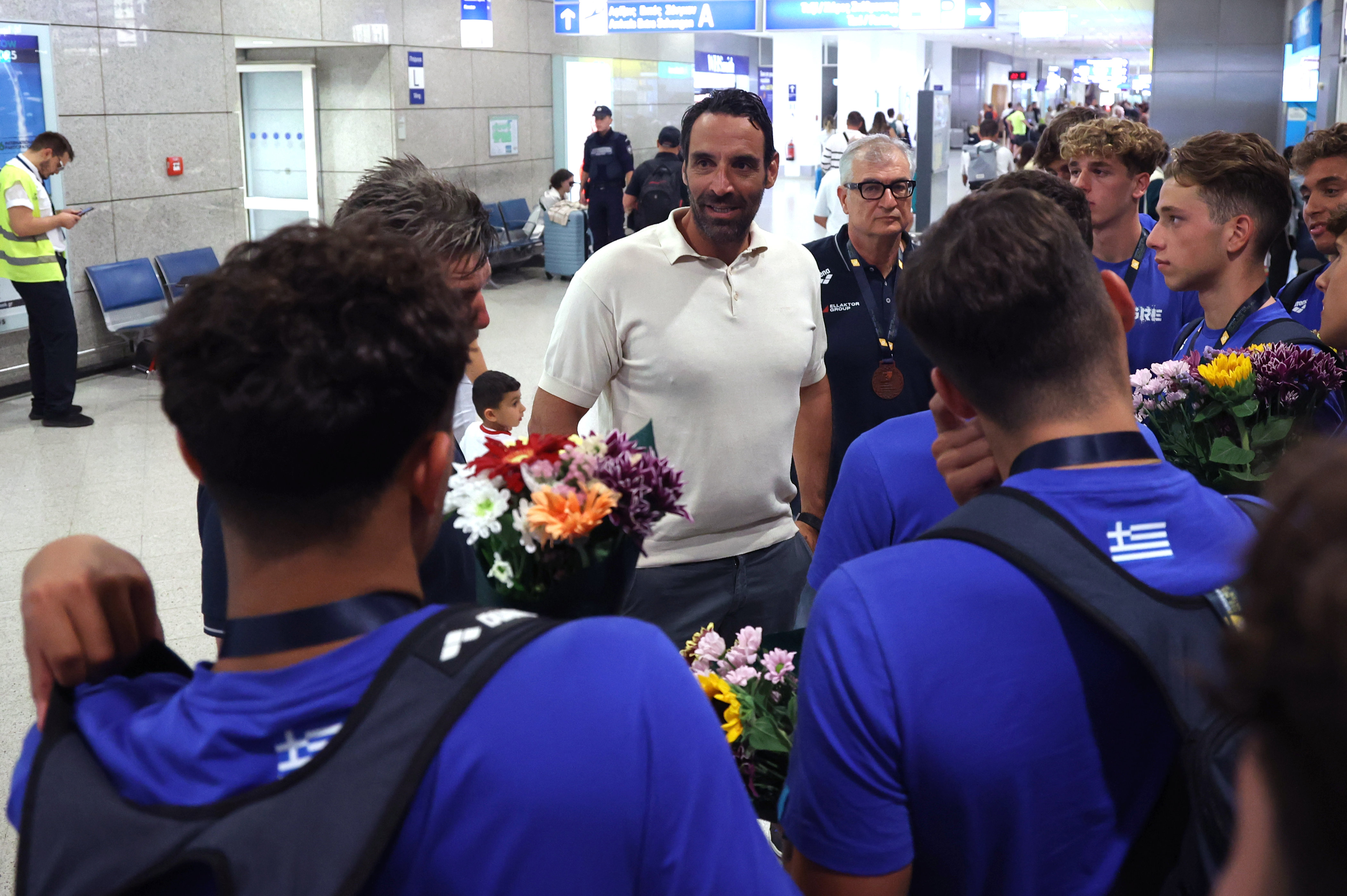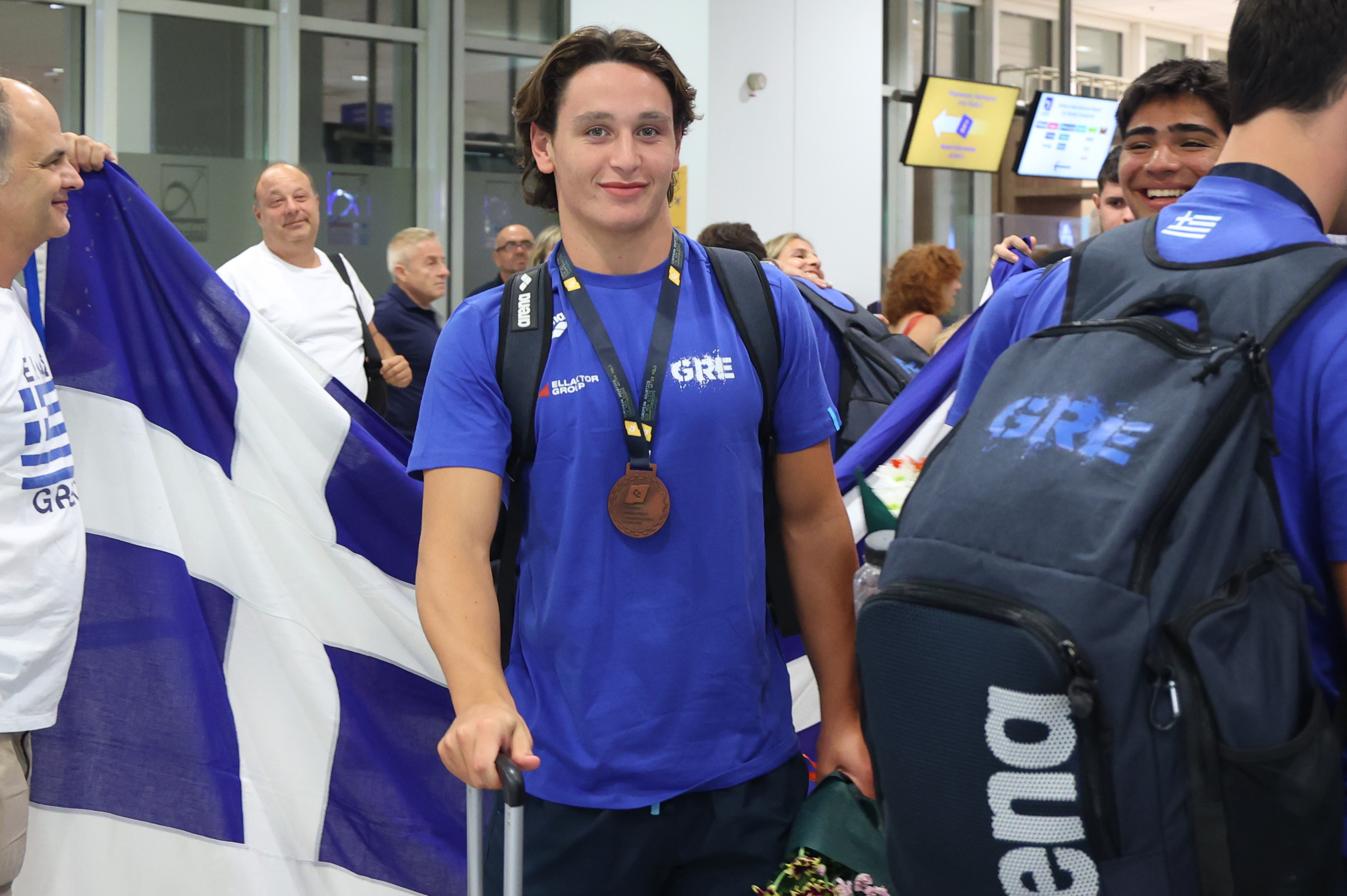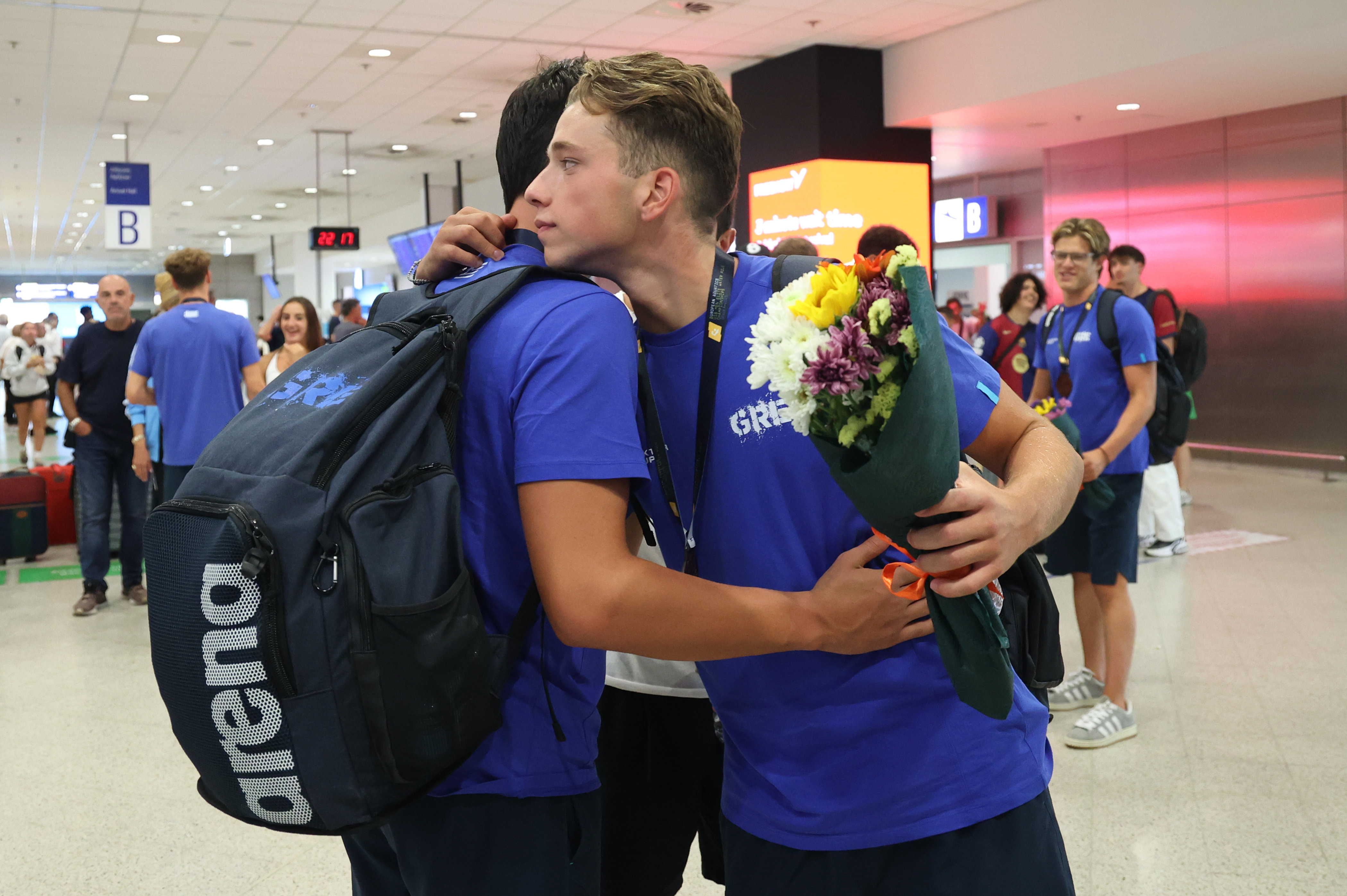 Στο αεροδρόμιο «Ελευθέριος Βενιζέλος» υποδέχθηκε την αποστολή εκ μέρους της Κολυμβητικής Ομοσπονδίας, ο Α΄Αντιπρόεδρος, Γιώργος Αφρουδάκης, ενώ παρόντες ήταν συγγενείς και φίλοι που χειροκρότησαν τους πρωταγωνιστές και τους πρόσφεραν ανθοδέσμες και μια μεγάλη, ζεστή αγκαλιά.