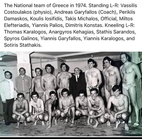 Στη βασική φωτογραφία της Εθνικής του 1974 διακρίνονται από πάνω από αριστερά προς τα δεξιά οι: Βασίλης Κωστουλάκος (φυσιοθεραπευτής), Ανδρέας Γαρύφαλλος (προπονητής), Περικλής Δαμάσκος, Κούλης Ιωσηφίδης, Μίλτος Ελευθεριάδης, Γιάννης Παληός, Δημήτρης Κώνστας.