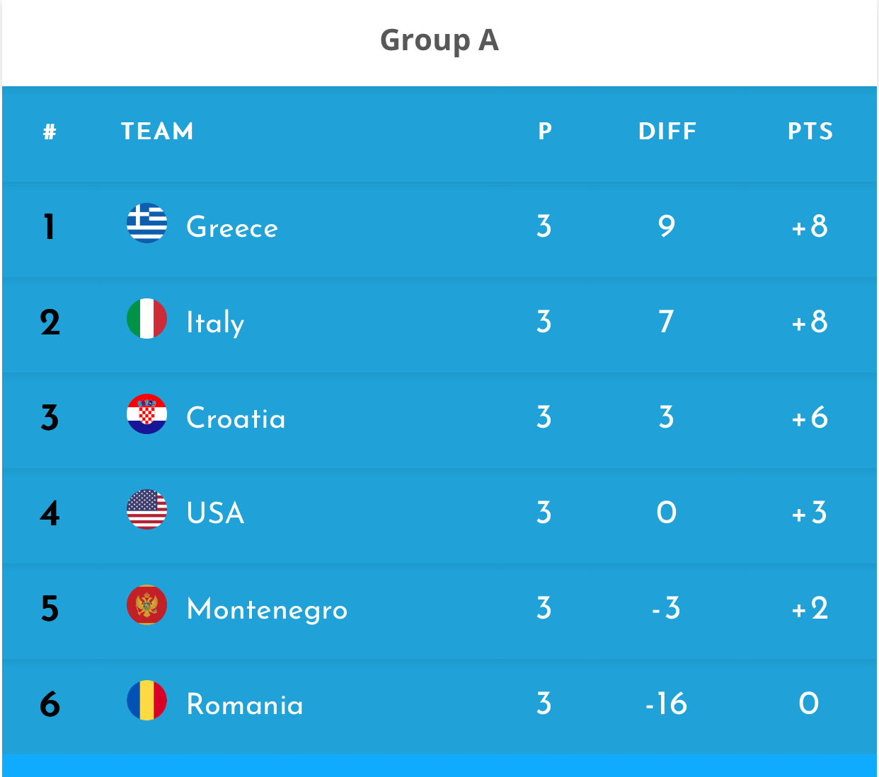 Και στα προημιτελικά και μακριά από τους Ισπανούς. Αυτό ήταν το επίτευγμα της εθνικής ομάδας υδατοσφαίρισης των αντρών την Πέμπτη 1 Αυγούστου, μετά την ολοκλήρωση των αγώνων της τρίτης αγωνιστικής του ολυμπιακού τουρνουά που πραγματοποιείται στο Παρίσι. Το αντιπροσωπευτικό συγκρότημα επικράτησε της ομάδας των Ηνωμένων Πολιτειών με 13 – 11 και βρίσκεται στην πρώτη θέση του πρώτου ομίλου με οκτώ βαθμούς, ισόβαθμο με την Ιταλία. Η Ιταλία επικράτησε του Μαυροβουνίου με 11-9 στην διαδικασία των πέναλτι, ενώ εύκολη – όπως αναμενόταν – ήταν η νίκη των Κροατών απέναντι στους Ρουμάνους.