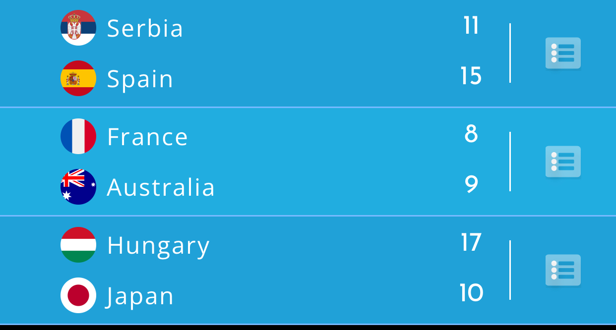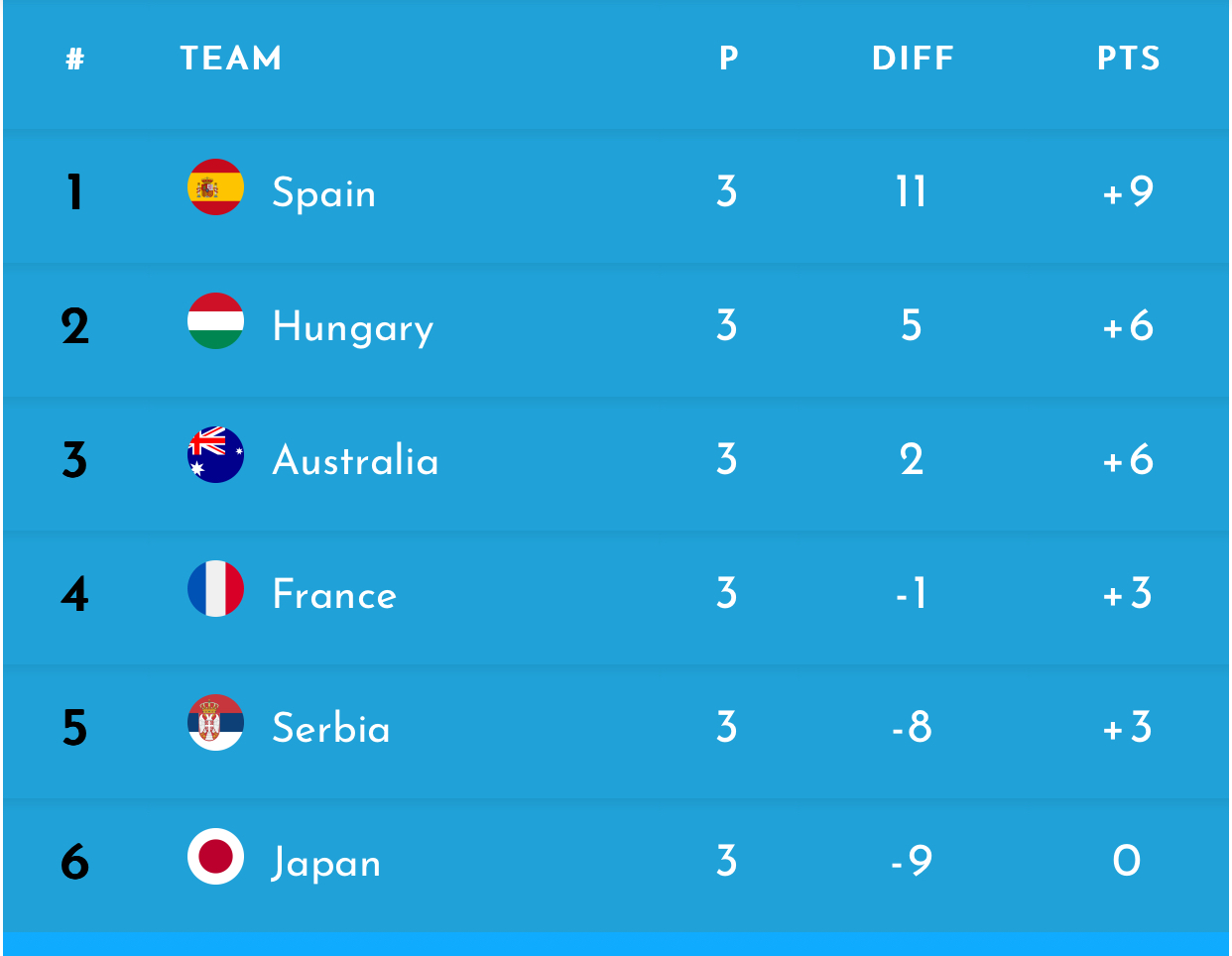 Στον δεύτερο όμιλο ή Ισπανία φαντάζει ανίκητη. Εντυπωσιάζει. Κανείς δεν θα την ήθελε αντίπαλο στην προημιτελική φάση. Πολύ κοντά στην πρόκριση στα προημιτελικά βρίσκονται η Ουγγαρία και η Αυστραλία. Την δική τους μάχη θα δώσουν οι Σέρβοι με τους Γάλλους στο παιχνίδι που ακολουθεί το Σάββατο. Δείτε την βαθμολογία του ομίλου, τα σημερινά αποτελέσματα και τα παιχνίδια της επόμενης αγωνιστικής.