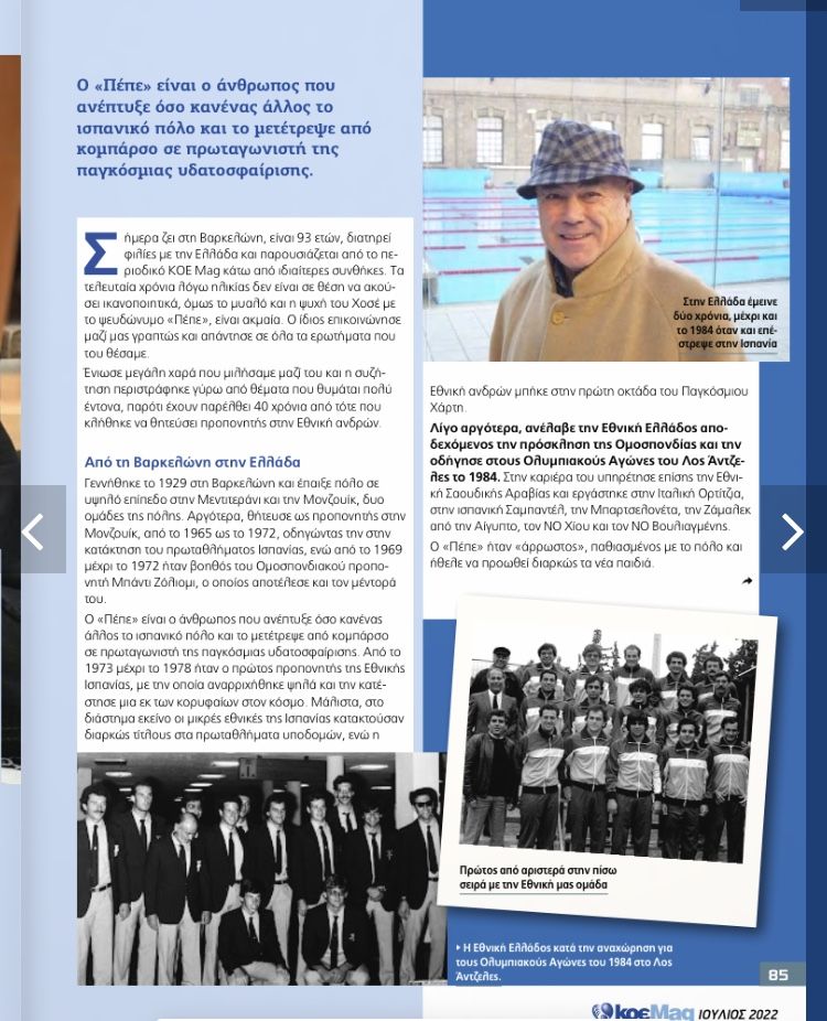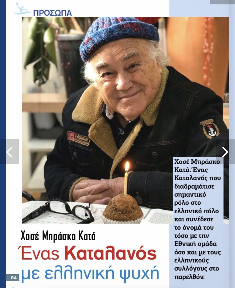 Έφυγε από την ζωή σε ηλικία 93 ετών ο Καταλανός προπονητής υδατοσφαίρισης και μεγάλος θρύλος του παγκόσμιου πόλο, ο Χοσέ Μπράκο Κατά. Ο γνωστός σε όλους τους Έλληνες Πέπε εργάστηκε στην Ελλάδα επί σειρά ετών και οδήγησε την εθνική ομάδα των αντρών στους ολυμπιακούς αγώνες του Λος Άντζελες το 1984. Πριν από λίγους μήνες ο Πέπε είχε παραχωρήσει την τελευταία του συνέντευξη στον δημοσιογράφο Νίκο Χαραλαμπόπουλο για λογαριασμό του επίσημου περιοδικού της κολυμβητικής ομοσπονδίας. Μια συνέντευξη την οποία φιλοξενούμε κατωτέρω για να δείτε την άποψη του Πέπε για το ελληνικό και παγκόσμιο πόλεμο. Καλό ταξίδι στον Καταλανό με την ελληνική ψυχή.