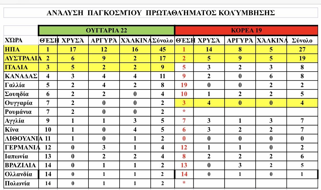 Σας παρουσιάζουμε τον κάτωθι πίνακα (δείτε την φωτογραφία) με τις κατατάξεις και τα μετάλλια που κέρδισαν οι καλύτερες χώρες στις δυο τελευταίες διοργανώσεις του παγκόσμιου πρωταθλήματος, το 2019 στην Κορέα και το 2022 στην Βουδαπέστη. Να σημειωθεί ότι η Ρωσία που δεν μετείχε (λόγω του πολέμου) στην διοργάνωση της Βουδαπέστης, το 2019 στην Κορέα είχε καταλάβει την 4η θέση στην κατάταξη με 16 μετάλλια (3 χρυσά, 7 αργυρά και 6 χαλκινα).