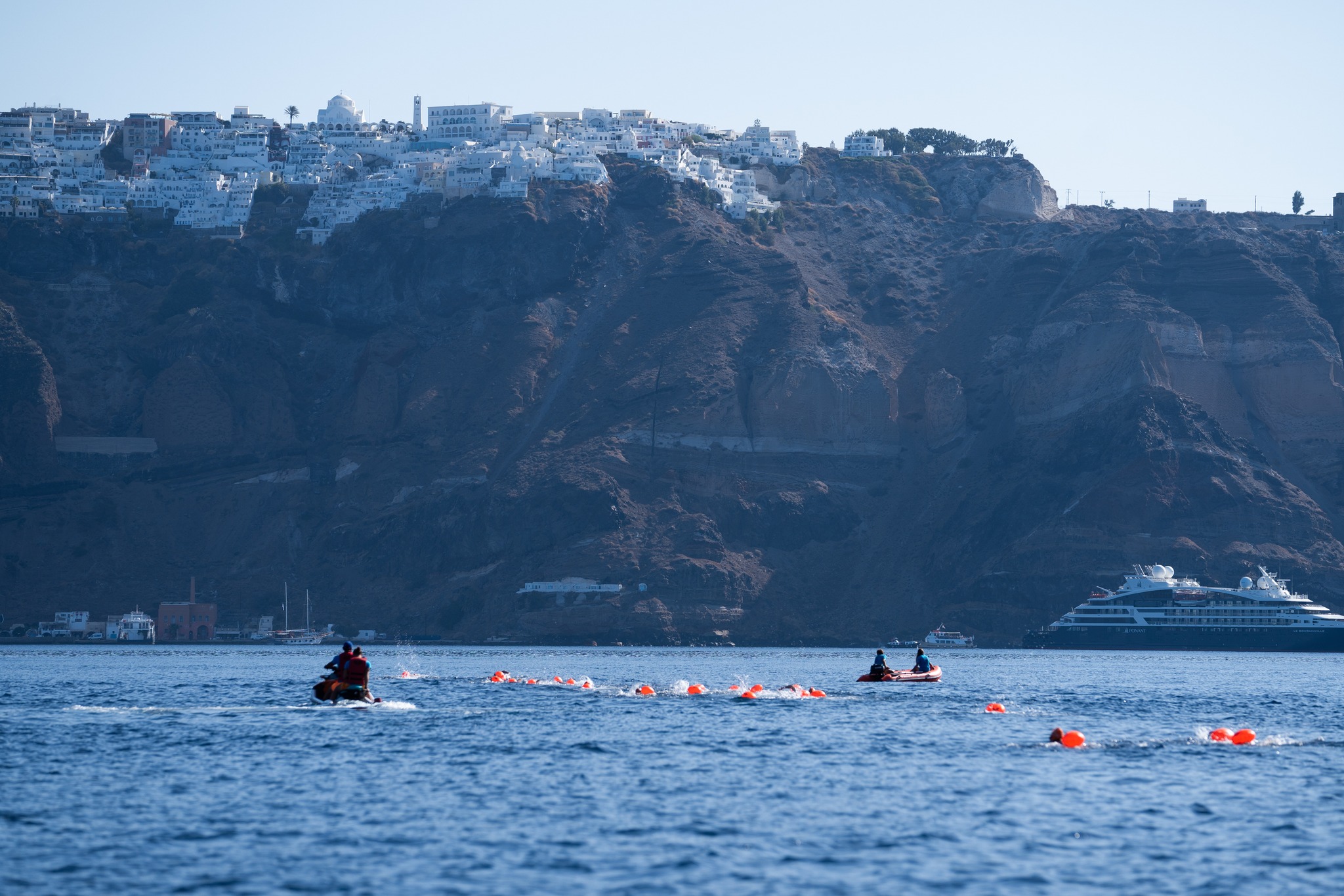 Μια από τις πιο εντυπωσιακές δράσεις του προγράμματος θα είναι η κολυμβητική διαδρομή open water που θα διεξαχθεί το πρωί της Παρασκευής 10 Οκτωβρίου. Οι συμμετέχοντες θα διανύσουν μια ξεχωριστή διαδρομή 2,4 χλμ. (1,5 μίλι), ξεκινώντας από το Ηφαίστειο και τερματίζοντας στο παλιό λιμάνι των Φηρών, έχοντας ως φόντο την επιβλητική θέα του νησιού. Πρόκειται για μια διαδρομή που παρέχεται στους συμμετέχοντες μόνο μια φορά τον χρόνο με άδεια από την Περιφερειακή Υπηρεσία Τουρισμού Κυκλάδων και με τη σύμφωνη γνώμη του Λιμεναρχείου Θήρας. Τα νερά με βάθος που φτάνουν μέχρι και τα 400 μέτρα και θερμοκρασία γύρω στους 22-23°C, προσφέρουν τις ιδανικές συνθήκες για έναν απολαυστικό αγώνα. Η διοργάνωση δίνει ιδιαίτερη έμφαση στην ασφάλεια των αθλητών, με την παρουσία εξειδικευμένων ναυαγοσωστών και ναυαγοσωστικών σκαφών καθ’ όλη τη διάρκεια της διαδρομής. Στην ασφάλεια του αγώνα θα συμβάλλουν επίσης οι επαγγελματίες ναυαγοσώστες και τα σκάφη της Lifeguard Patrol, που θα φροντίσουν και για τον απαραίτητο φαρμακευτικό και ιατρικό εξοπλισμό. Την κολύμβηση θα υποστηρίξουν ακόμα με σκάφη και προσωπικό η Ένωση Λεμβούχων Σαντορίνης, η Caldera Yachting και ο Ναυτικός Όμιλος Σαντορίνης, ενώ η διοργάνωση θα εξασφαλίσει για όλους τους αθλητές σωσίβιο ασφαλείας, παρέχοντας επιπλέον προστασία σε κάθε συμμετέχοντα. Η χρήση ατομικού πλωτήρα είναι υποχρεωτική για όλους. Τεχνικός Διευθυντής του αγώνα είναι ο κορυφαίος προπονητής Νίκος Γέμελος, με πολυετή εμπειρία και σημαντικές διακρίσεις σε Ολυμπιακούς αγώνες και παγκόσμια πρωταθλήματα.