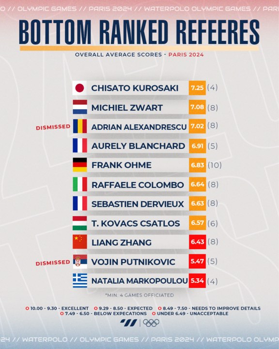 Η σελίδα Total Water Polo, μία από τις κορυφαίες πηγές ενημέρωσης για το άθλημα της υδατοσφαίρισης, άσκησε αυστηρή κριτική στους διαιτητές και στις αποφάσεις τους κατά τη διάρκεια του ολυμπιακού τουρνουά στο Παρίσι. Η ιστοσελίδα επικεντρώθηκε στα πολλά και σοβαρά λάθη που σημειώθηκαν τόσο στο ανδρικό όσο και στο γυναικείο τουρνουά, ενώ έθεσε σημαντικά ερωτήματα σχετικά με την επιλογή διαιτητών για τα κρίσιμα παιχνίδια.