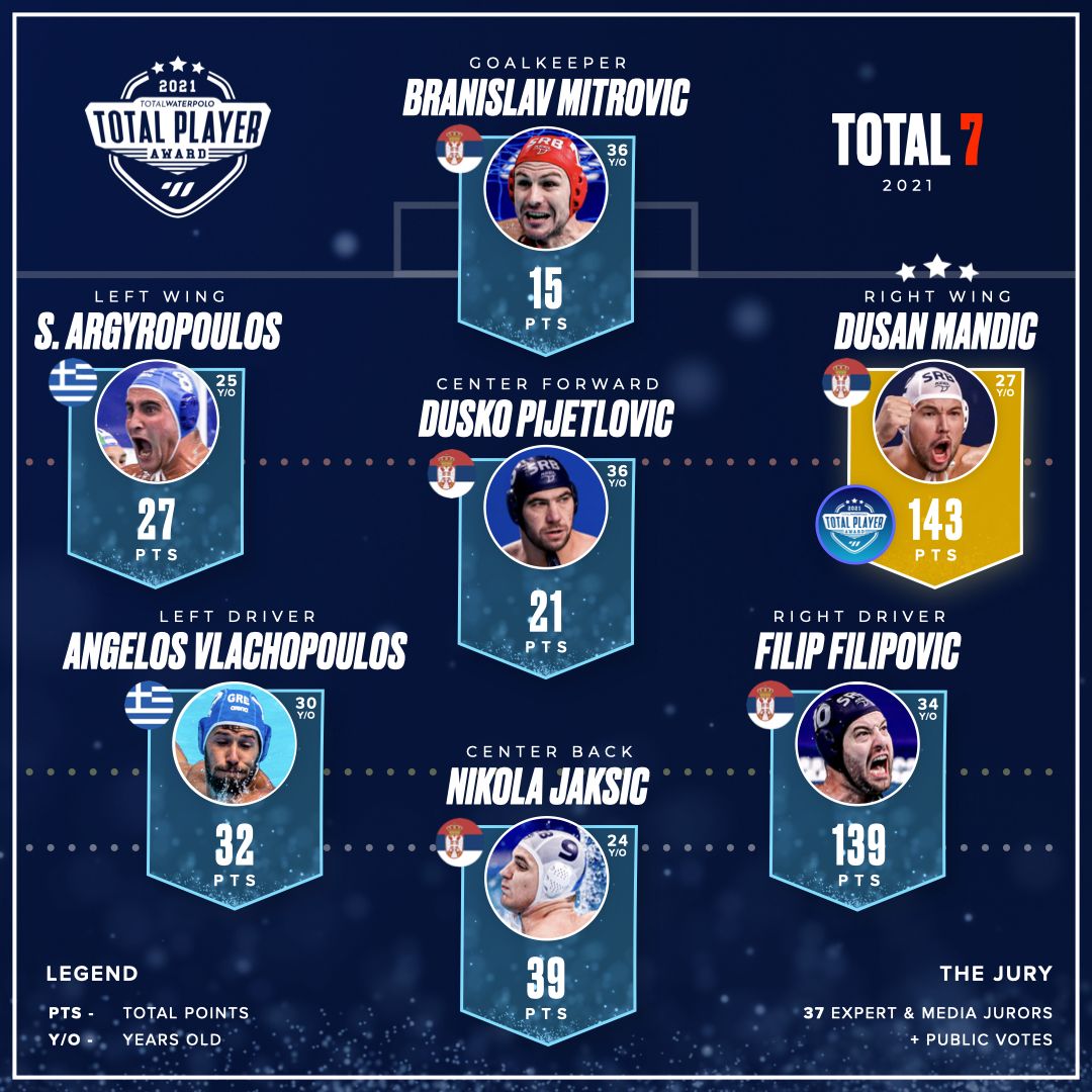 Μεγάλη τιμή για την Ελλάδα. Στην κορυφαία ομάδα του κόσμου για το 2021 συγκαταλέγονται πέντε Σέρβοι οι δύο Έλληνες παίκτες. Όπως έχει προαναφερθεί τις τελευταίες ημέρες, ο Άγγελος Βλαχόπουλος και ο Στέλιος Αργυρόπουλος – Κανακάκης, συγκαταλέγονται στους κορυφαίους αθλητές της χρονιάς που έφυγε. Όλα αυτά σύμφωνα με την ψηφοφορία που διεξήγαγε, μεταξύ των κορυφαίων προπονητών και αθλητών του κόσμου, η κορυφαία σελίδα του αθλήματος, το total water polo.