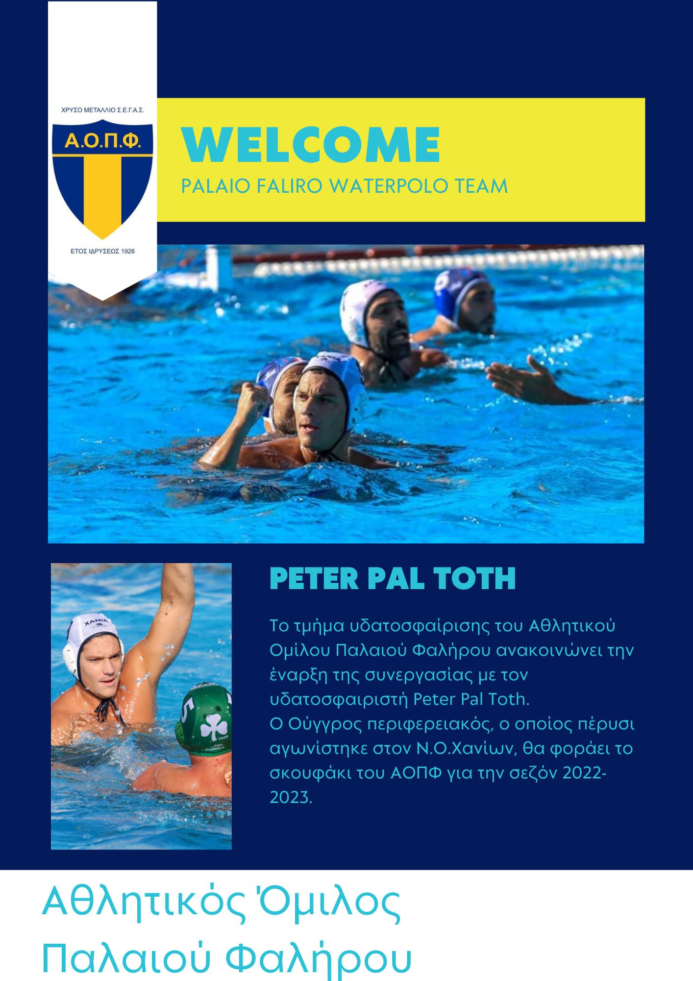 Το τμήμα υδατοσφαίρισης του Αθλητικού Ομίλου Παλαιού Φαλήρου ανακοινώνει την έναρξη της συνεργασίας με τον Ουγγρο υδατοσφαιριστή Peter Pal Toth.