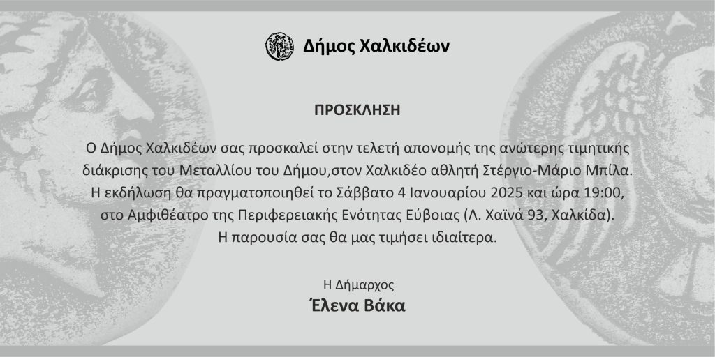 Ο Δήμος Χαλκιδέων, αναγνωρίζοντας τις εξαιρετικές διακρίσεις του στον αθλητισμό, τιμά τον Χαλκιδέο αθλητή Στέργιο-Μάριο Μπίλα, με την απονομή της ανώτερης τιμητικής διάκρισης του Μεταλλίου του Δήμου.