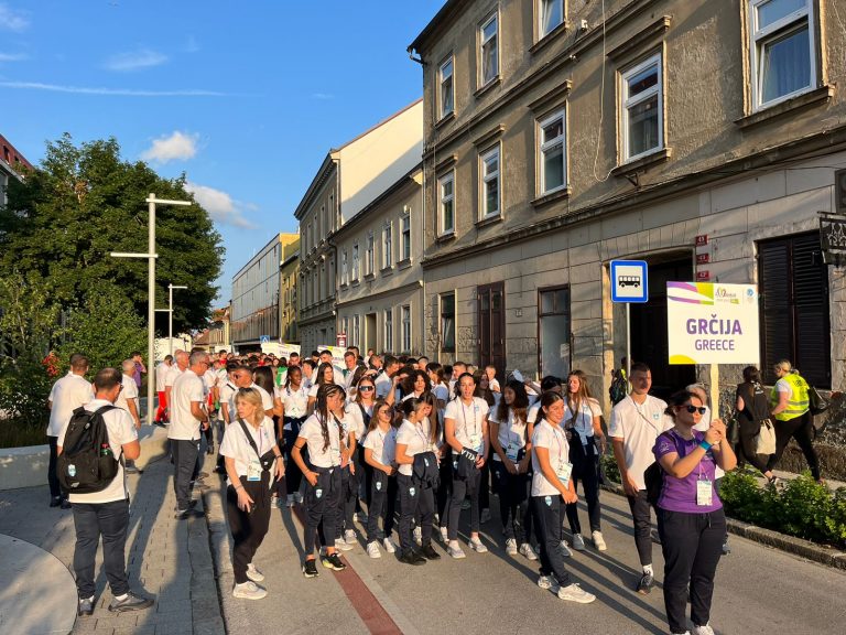 Με Σημαιοφόρους τους πρωταθλητές του στίβου και της κολύμβησης αντίστοιχα, Γιάννη Γκάρτσιο και Αντωνία Ρακοπούλου, η Ελλάδα μπήκε πρώτη στο Στάδιο του Μάριμπορ, στην Τελετή Εναρξης του Ευρωπαϊκού Ολυμπιακού Φεστιβάλ Νέων.
