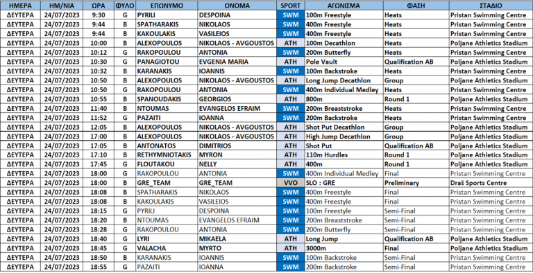 To πρόγραμμα της Δευτέρας 24 Ιουλίου για την ελληνική ομάδα