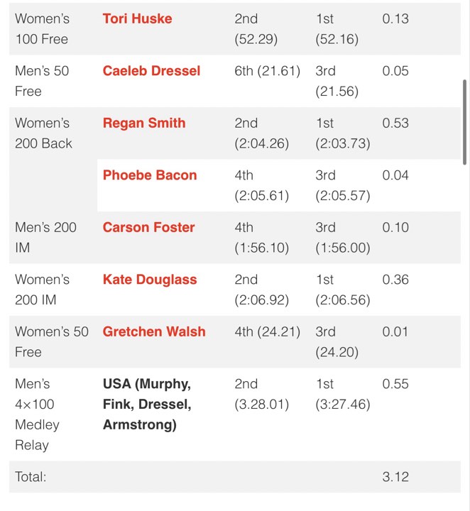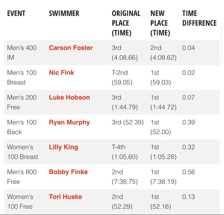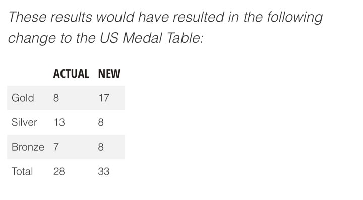 Αν αναλογιστούμε όλες τις κοντινές κούρσες (με διαφορά χρόνου έως περίπου 0.6 δευτερόλεπτα) και συγκρίνουμε τα πιθανά μετάλλια που ήταν προσεγγίσιμα, βλέπουμε ότι λιγότερα από τέσσερα δευτερόλεπτα συνολικά (3.12) θα μπορούσαν να είχαν χαρίσει στις Ηνωμένες Πολιτείες εννέα επιπλέον χρυσά μετάλλια.