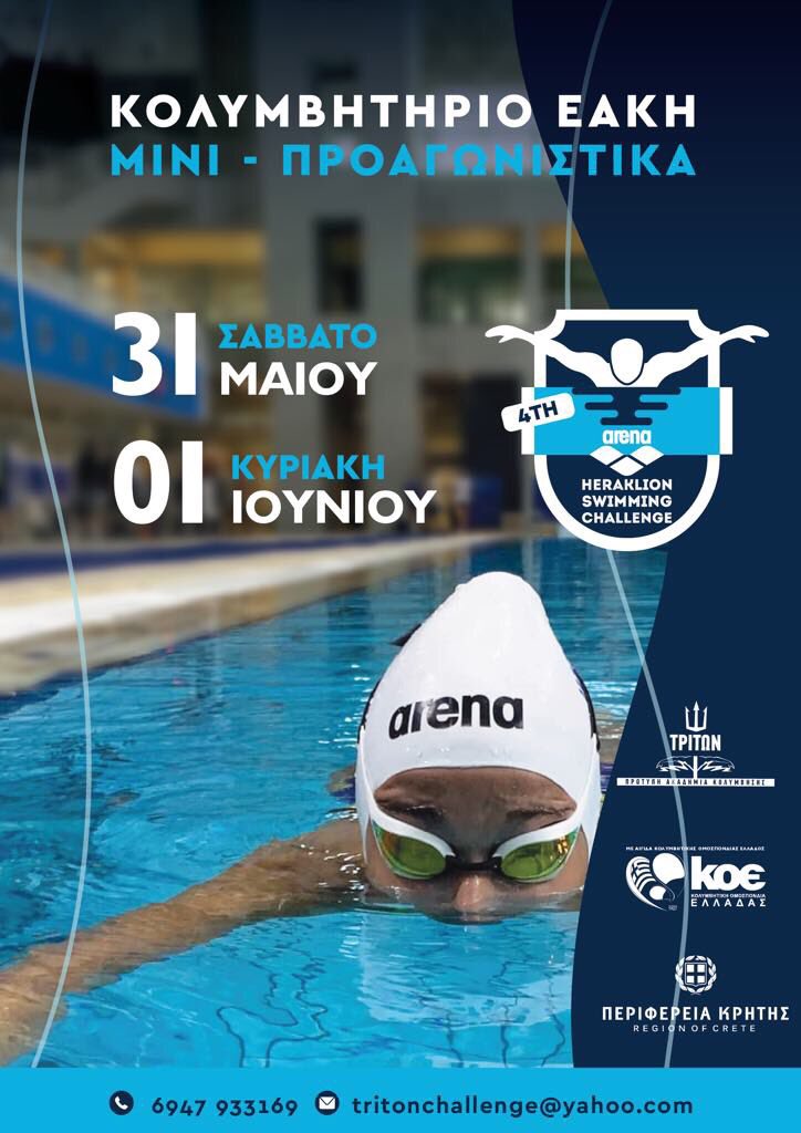 Το προσεχές διήμερο Σάββατο 31 Μαϊου και Κυριακή 1 Ιουνίου 2025 στο Εθνικό Αθλητικό Κέντρο Ηρακλείου Κρήτης ο σύλλογος Α.Ο.ΤΡΙΤΩΝΑΣ ΗΡΑΚΛΕΙΟΥ, υπό την αιγίδα της ΚΟΕ και της Περιφερειακής Επιτροπής Κρήτης διοργανώνει τους κολυμβητικούς αγώνες προ-αγωνιστικών και mini κατηγοριών με την επωνυμία "4th ARENA HERAKLION SWIMMING CHALLENGE".