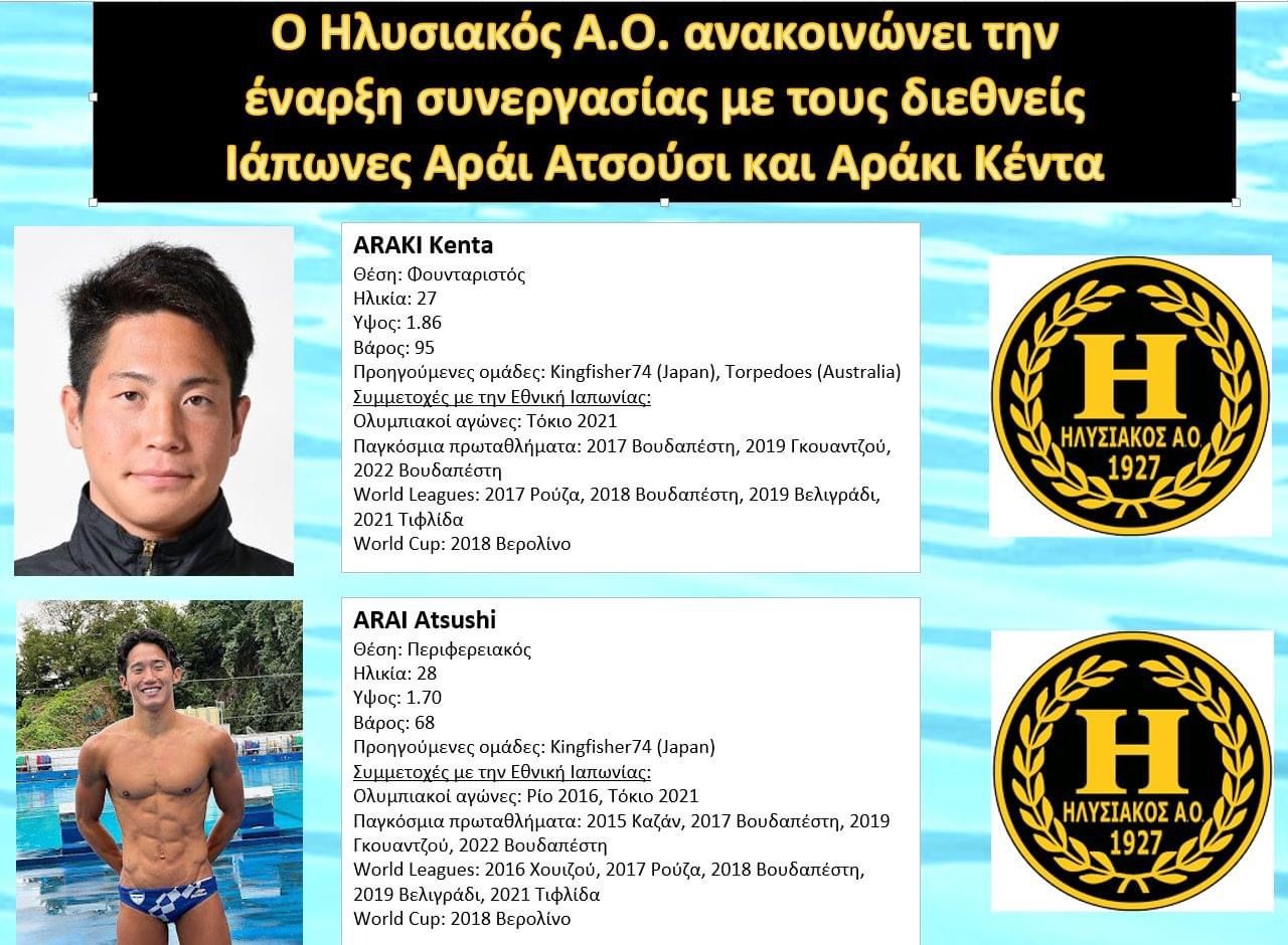 Ο πρώτος σύλλογος που εμπιστεύεται τους Ιάπωνες είναι ο νεοφώτιστος Ηλυσιακός. Η ομάδα του Τάσου Σχίζα ανακοίνωσε την παρουσία δύο Ιαπώνων στο ρόστερ της νέας αγωνιστικής περιόδου. Πρόκειται για τον Αράϊ Ατσούσι, 28 ετών, περιφερειακό και τον Αράκι Κέντα, 27 ετών, φουνταριστό.