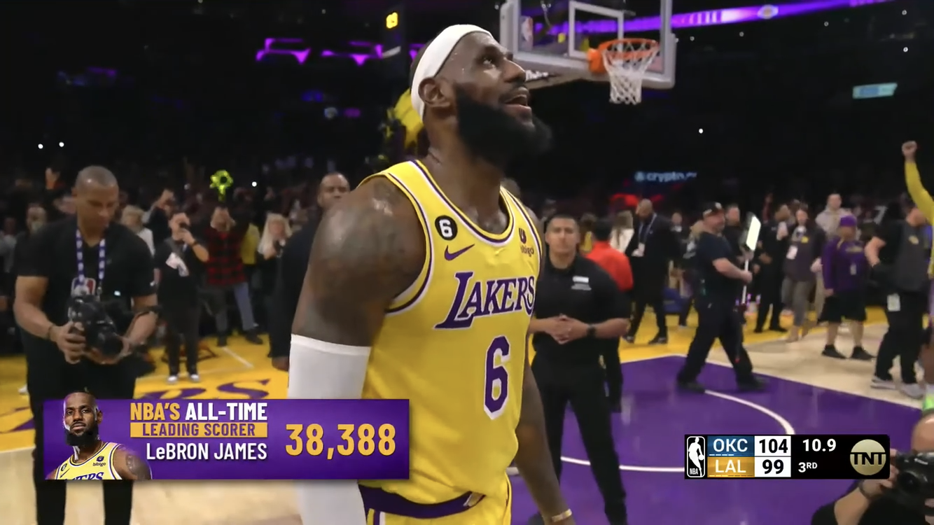 Με 10,9’ δευτερόλεπτα να απομένουν για το τρίτο δωδεκάλεπτο, ο Τζέιμς χρησιμοποίησε το γνωστό «Step Back» του Michael Jordan σημειώνοντας τον 36ο πόντο του αγώνα και τον 38.388ο στην καριέρα του. Τέντωσε τα χέρια του πανηγυρίζοντας καθώς το υπερφορτωμένο πλήθος στο Crypto Arena του Λος Άντζελες ξέσπασε σε κραυγές ευτυχίας.
