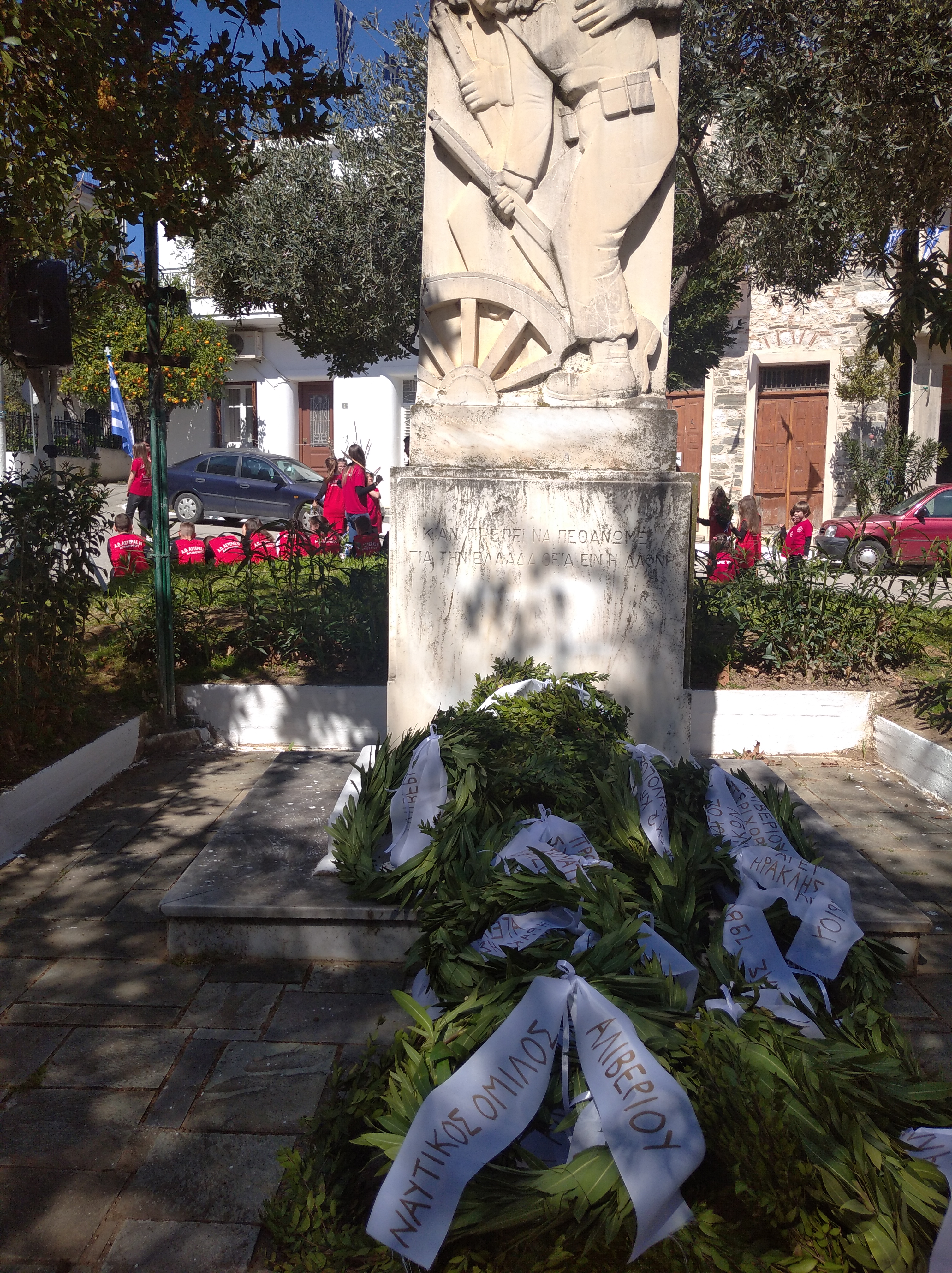 Μετά την τέλεση της επίσημης δοξολογίας στον Ιερό Ναό Αγίου Γεωργίου και την εκφώνηση του Πανηγυρικού της ημέρας, πραγματοποιήθηκε επιμνημόσυνη δέηση στο Μνημείο Πεσόντων Ηρώων, κατάθεση στεφάνων και τήρηση ενός λεπτού σιγής στη μνήμη εκείνων που έπεσαν για την ελευθερία του Έθνους.