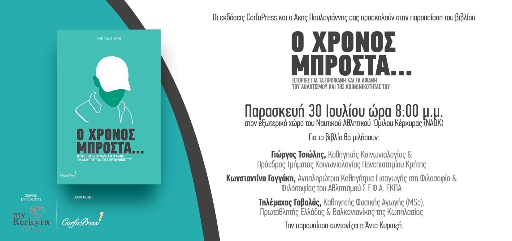 Η παρουσίαση του βιβλίου θα γίνει την Παρασκευή 30 Ιουλίου στις 8 το βράδυ στον ανοικτό χώρο του ιστορικού Ναυτικού Αθλητικού Ομίλου Κέρκυρας (ΝΑΟΚ).