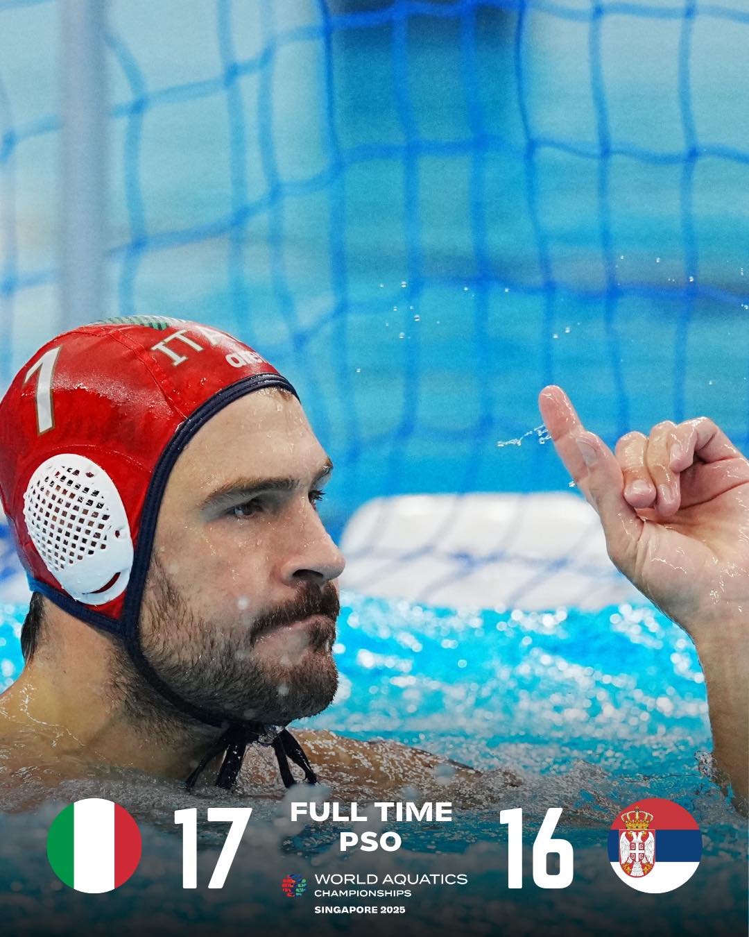 Ο λόγος για την Ιταλία που κατάφερε να λυγίσει την αντίσταση της Σερβίας με 17-16 στα πέναλτι και να «καπαρώσει» την πρώτη θέση του Α΄ ομίλου. Η ομάδα του Σάντρο Καμπάνια εξασφάλισε ουσιαστικά την απευθείας πρόκριση στα προημιτελικά (την τελευταία αγωνιστική παίζει με την πολύ αδύναμη Νότια Αφρική) κι εκεί ενδέχεται να βρεθεί αντίπαλος με την εθνική Ελλάδας, εφόσον το συγκρότημα του Θοδωρή Βλάχου ηττηθεί από την Κροατία, την Τετάρτη (16/7).