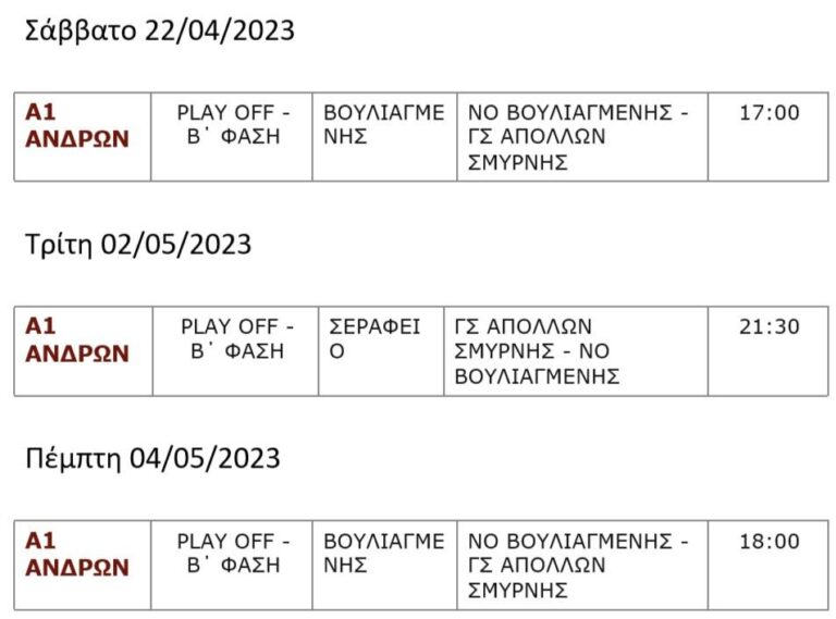 Ο 2ος αγώνας με τη Βουλιαγμένη έχει οριστεί τρεις μέρες μετά τον 2ο Τελικό του Challenger Cup στην Ισπανία, ήτοι την Τρίτη 2 Μαΐου στις 21:30 στο Σεράφειο κολυμβητήριο. Αν χρειαστεί 3ο παιχνίδι για την πρόκριση στους Τελικούς, αυτό θα γίνει την Πέμπτη 4 Μαΐου στις 18:00 και πάλι στην έδρα του ΝΟΒ.