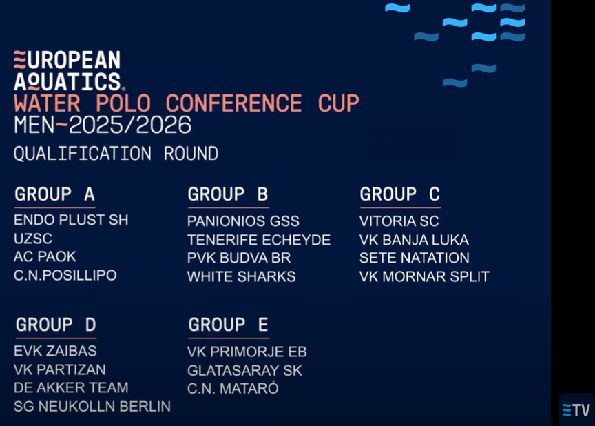 Σήμερα, Δευτέρα 11 Αυγούστου, πραγματοποιήθηκε από την European Aquatics η κλήρωση για το Conference Cup Υδατοσφαίρισης Ανδρών, με την Ελλάδα να εκπροσωπείται από δύο συλλόγους, τον ΠΑΟΚ και τον Πανιώνιο.