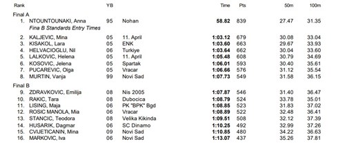 Σπουδαία εμφάνιση πραγματοποίησεστο Βελιγράδι η Άννα Ντουντουνάκη, η οποία κατέλαβε την πρώτη θέση στα 100 πεταλούδα με 58.82.