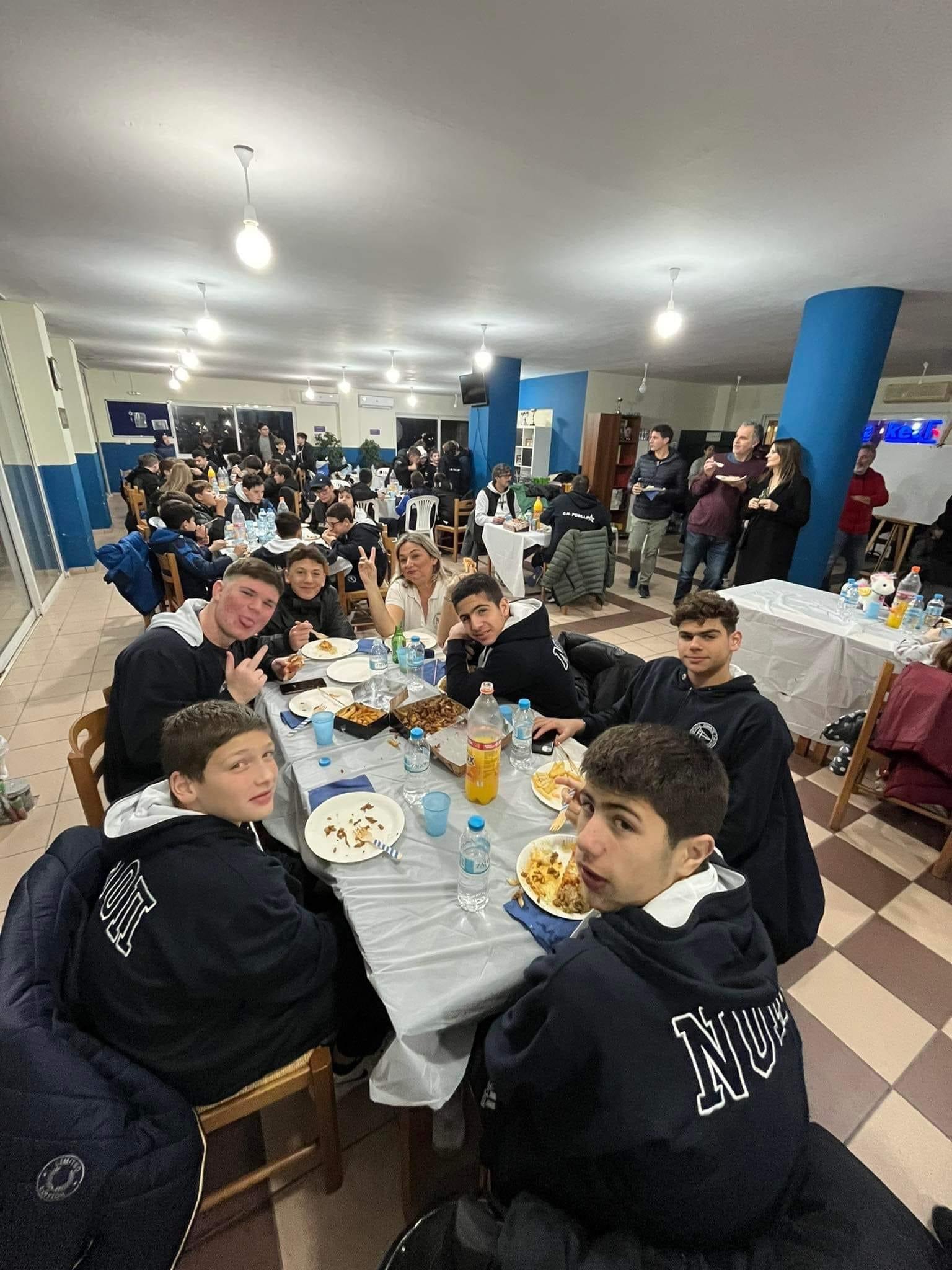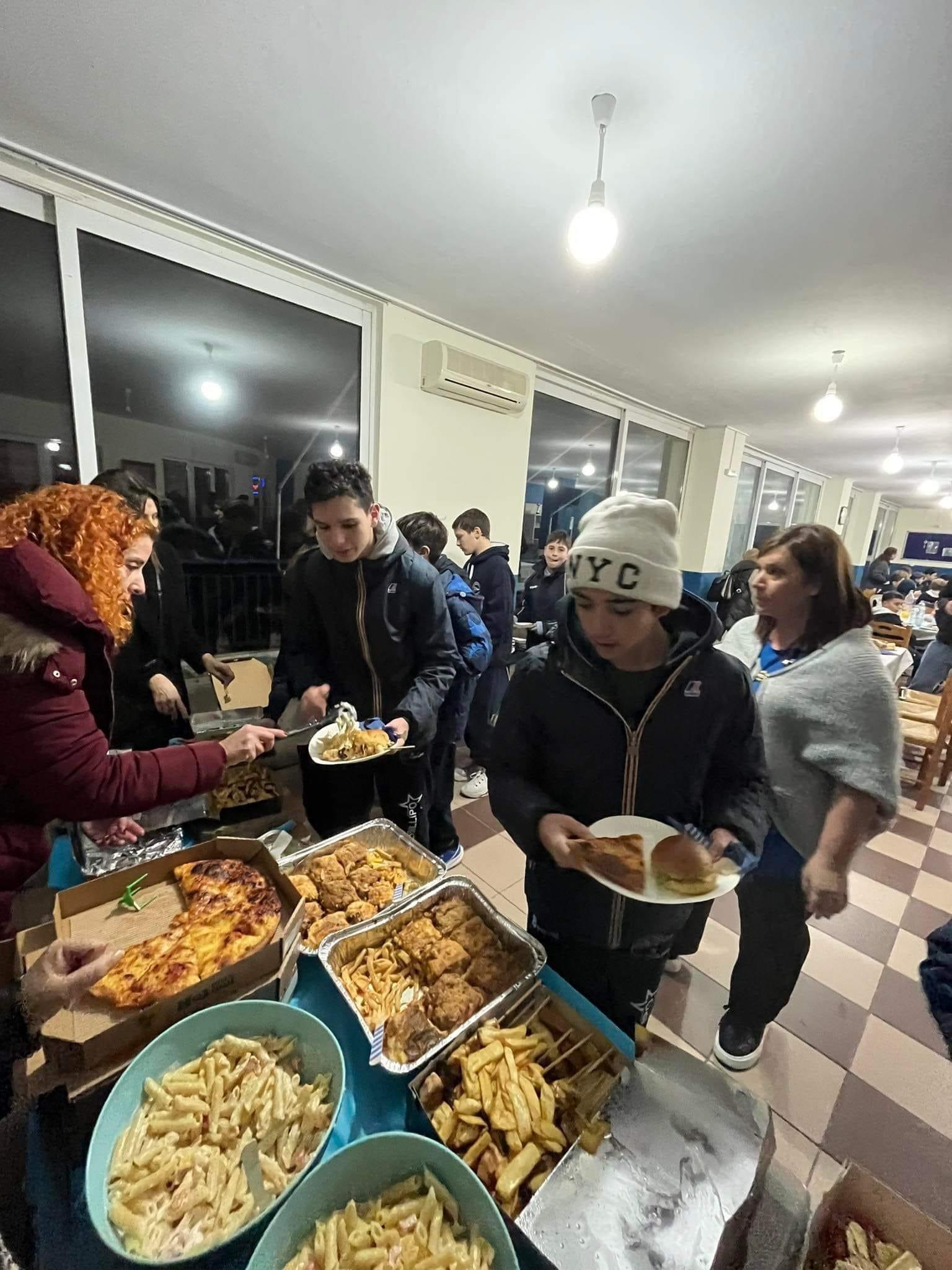 Η αποστολή της Posillipo πρώτα ξεναγήθηκε στην αίθουσα τροπαίων του ΝΟΠ και στη συνέχεια απόλαυσε ένα πλούσιο γεύμα, προσφορά των γονέων των αθλητών μας. Στους παίκτες της Posillipo δόθηκαν ένα λεύκωμα του καρναβαλιού από το εμπορικό επιμελητήριο Αχαΐας και μια σακούλα με προϊόντα από τα ΛΟΥΚΟΥΜΙΑ ΚΟΥΛΟΥ.