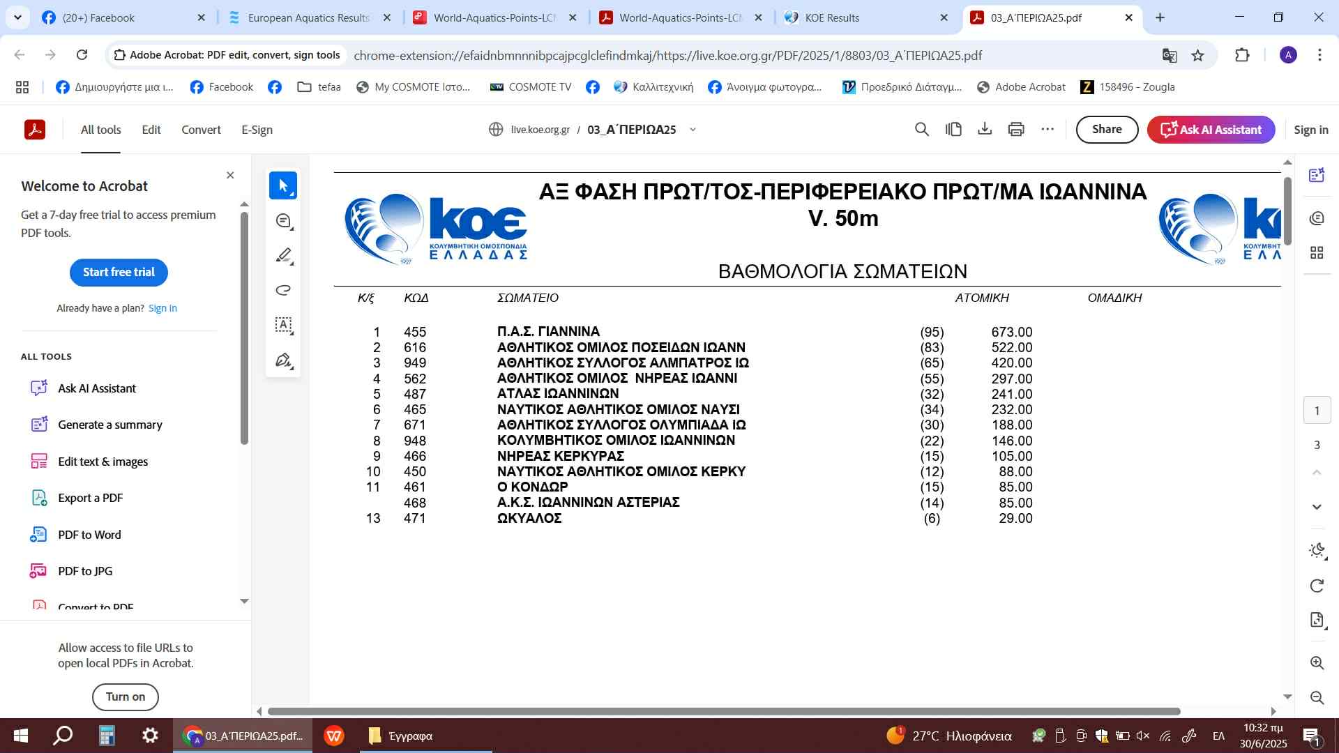 «Ο ΠΑΣ Γιάννινα αναδείχθηκε πρωταγωνιστής στο Περιφερειακό Πρωτάθλημα Κολύμβησης 2025, κατακτώντας την 1η θέση στη συνολική βαθμολογία ,την 1η θέση στη βαθμολογία ανδρών και τη 2η θέση στη βαθμολογία γυναικών με τη συμμετοχή 33 αθλητών και αθλητριών!