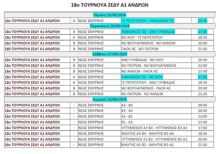 Την Κυριακή (28/9) το πρωί θα πραγματοποιηθούν οι ημιτελικοί και το απόγευμα της ίδιας ημέρας ο τελικός και οι αγώνες κατάταξης.