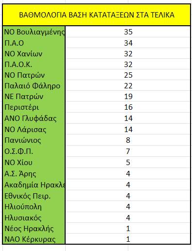 Αυτό δυσκολεύει το να βγάλουμε μια άτυπη συνολική βαθμολογία, παρόλα αυτά όμως προχωρήσαμε δίνοντας στην τελευταία ομάδα 1 βαθμό και ανεβαίνοντας προς τα πάνω προσθέτουμε ένα βαθμό ανά θέση. Και σε αυτή την άτυπη βαθμολογία ο Ναυτικός Όμιλος Βουλιαγμένης είναι πρώτος, ενώ δεύτερος είναι ο Παναθηναϊκός που κατάφερε να έχει καλά πλασαρίσματα και στα πρωταθλήματα που δεν κατάφερε να πάρει μετάλλιο.