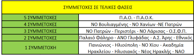 Στις πέντε τελικές φάσεις συμμετείχαν είκοσι διαφορετικές ομάδες. Ο Παναθηναϊκός και ο ΠΑΟΚ είχαν συμμετοχή και στις πέντε τελικές φάσεις, ενώ ΝΟ Βουλιαγμένης, ΝΟ Χανίων και ΝΕ Πατρών συμμετείχαν σε τέσσερις τελικές φάσεις.