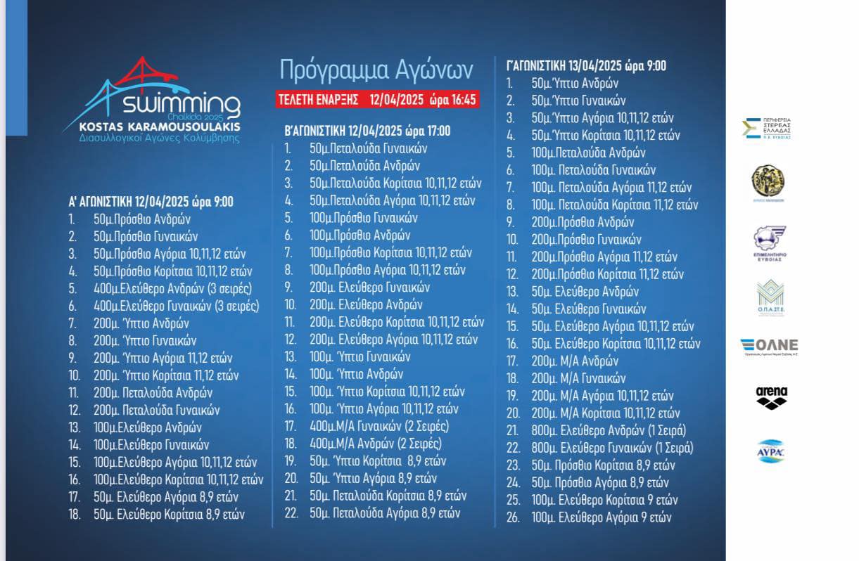 Το ερχόμενο Σαββατοκύριακο (12-13/4) θα φιλοξενηθούν στο ανοιχτό κολυμβητήριο της Χαλκίδας "Μελίνα Μερκούρη" οι 3οι Διασυλλογικοί Αγώνες Κολύμβησης με την επωνυμία "Κώστας Καραμουσουλάκης".