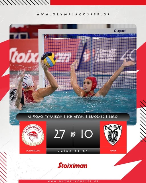 Ψεκάστε, σκουπίστε, τελειώσατε... Τόσο απλά ήταν τα πράγματα για τον Ολυμπιακό. Την Τρίτη (18/2) το μεσημέρι, οι «ερυθρόλευκες» νίκησαν με 27-10 τον ΠΑΟΚ στο κολυμβητήριο του Πειραιά, για τη 15η αγωνιστική της Α1 και... δήλωσαν έτοιμες για το Final-4 του Κυπέλλου Ελλάδας στον Βόλο (21-22/2).