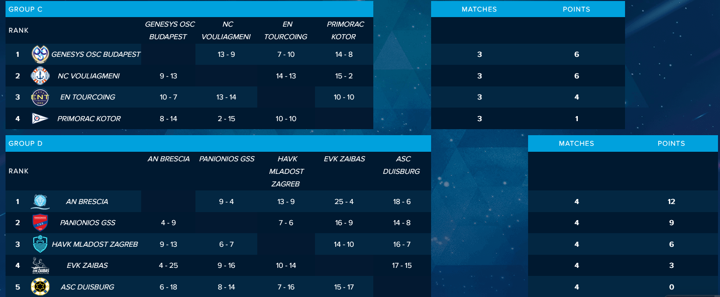 Αντίθετα, οι δύο ελληνικές ομάδες, Πανιώνιος και Βουλιαγμένη κατάφεραν να προκριθούν στην επόμενη φάση του τουρνουά, ο μεν ΝΟΒ χάρη στη νίκη του στο φινάλε με 14-13 επί της Τιρκουά, ο δε Πανιώνιος με τρεις νίκες σε τέσσερα ματς πραγματοποιώντας εξαιρετικές εμφανίσεις.