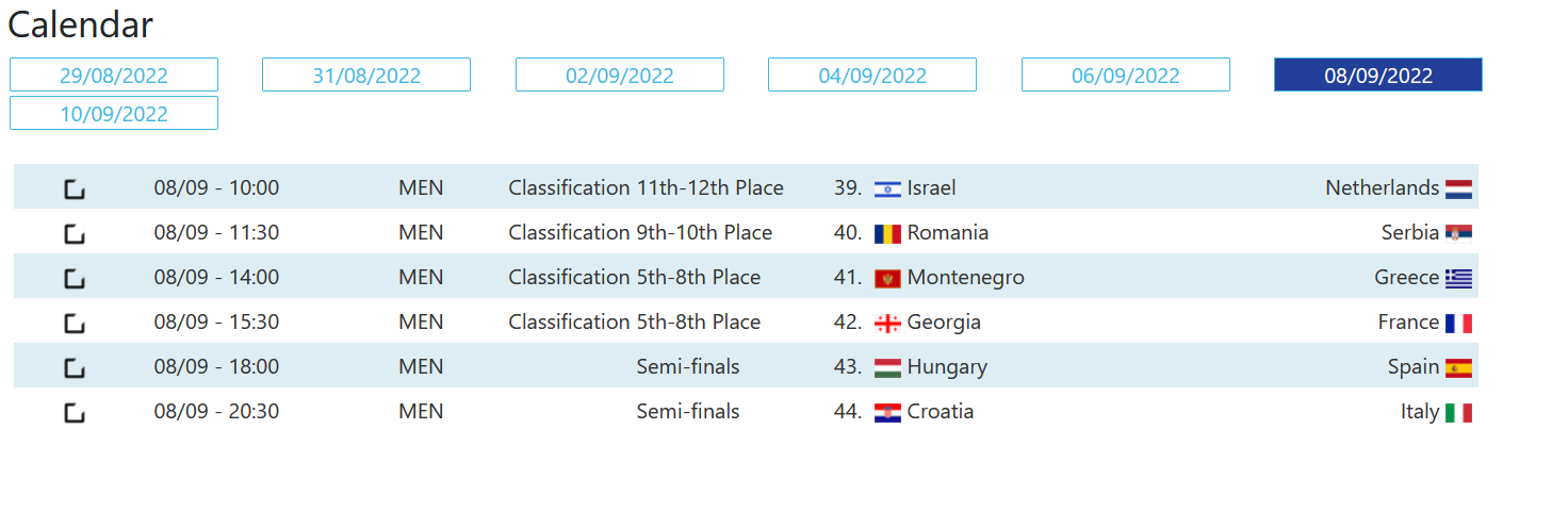 Στον άλλο ημιτελικό, η οικοδέσποινα Κροατία που ξεπέρασε χωρίς δυσκολία το εμπόδιο της Γεωργίας με 15-5, θα αναμετρηθεί με την Ιταλία η οποία επικράτησε των πάντα μαχητικών Γάλλων με 16-8.