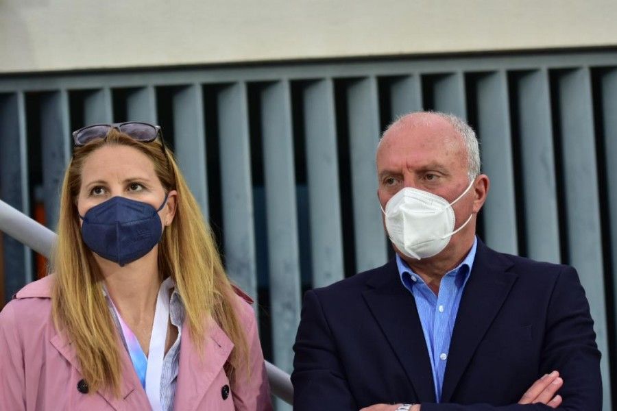 Το κολυμβητήριο είναι γεμάτο στους αγώνες του F-4. Όλους τους αγώνες παρακολουθεί ο Πρόεδρος της ΚΟΕ Κυριάκος Γιαννόπουλος με πολλά μέλη του ΔΣ (στη φωτο με την Έφη Μωραϊτίδου).