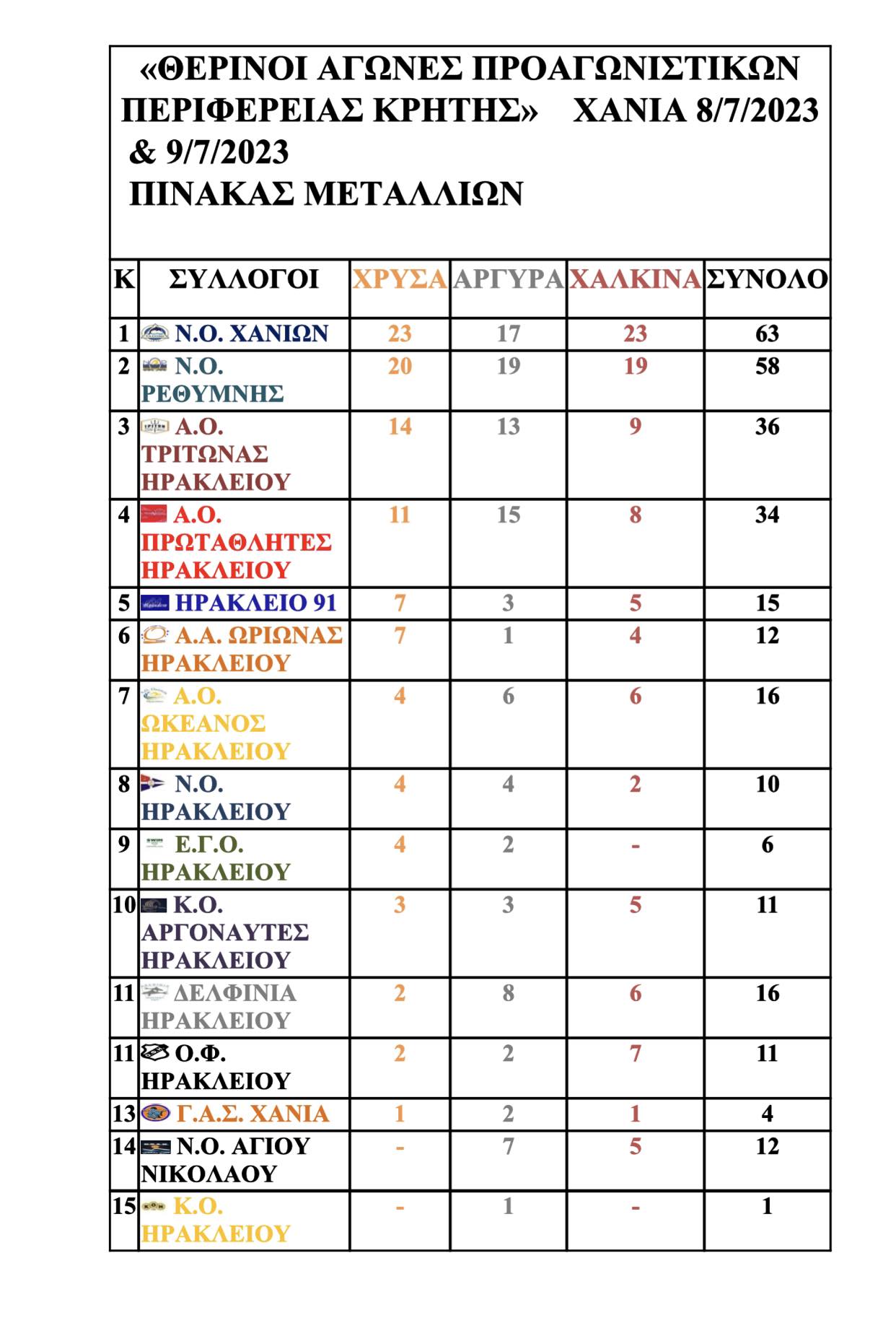Ο ΝΟΧ μέτρησε συνολικά 63 μετάλλια, εκ των οποίων τα 23 ήταν χρυσά, 17 αργυρά και 23 χάλκινα. Ακολούθησε ο ΝΟ Ρεθύμνης με 58 μετάλλια (20 χρυσά, 19 αργυρά και 19 χάλκινα), ενώ τρίτος ήταν ο ΑΟ Τρίτωνας Ηρακλείου με 36 μετάλλια (14 χρυσά, 13 αργυρά και 9 χάλκινα)