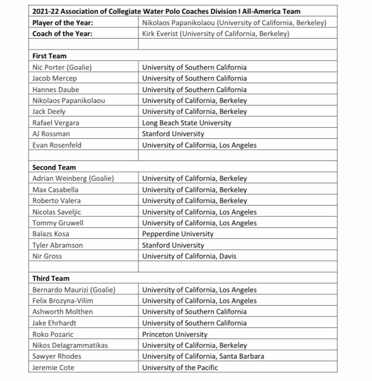Ο αθλητής του πανεπιστήμιο Μπέρκλεΐ της Καλιφόρνια συμπεριελήφθη φυσικά και στην καλύτερη ομάδα των πανεπιστημίων της χώρας.