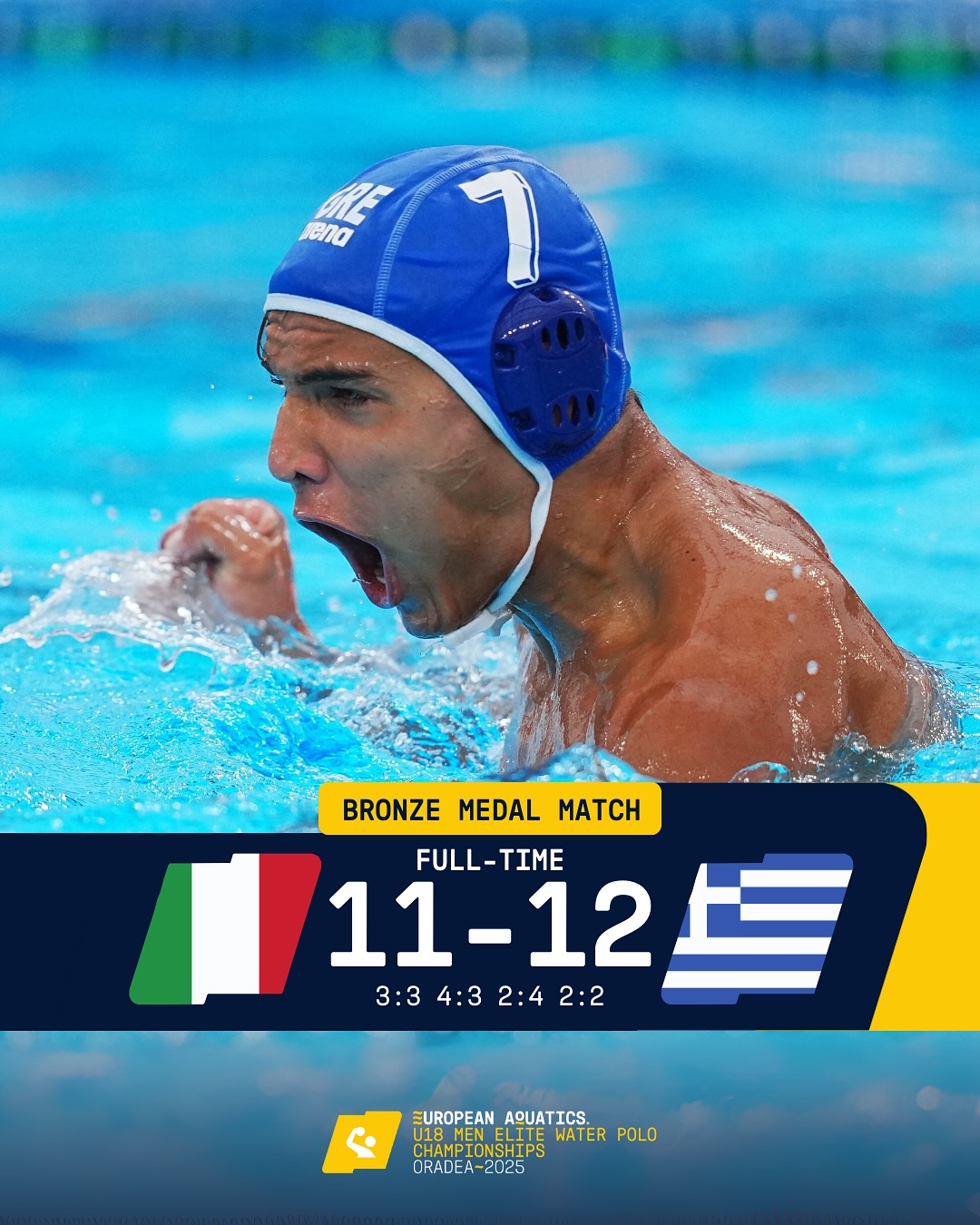 Με γκολ του Κωνσταντίνου Μπιτσάκου, μόλις 2.37 πριν ολοκληρωθεί ο μικρός τελικός (24/8), το αντιπροσωπευτικό μας συγκρότημα κατάφερε να λυγίσει την αντίσταση της Ιταλίας με 12-11 και να εξασφαλίσει μια θέση στο βάθρο, ολοκληρώνοντας με πανηγυρικό τρόπο την παρουσία της στη διοργάνωση.