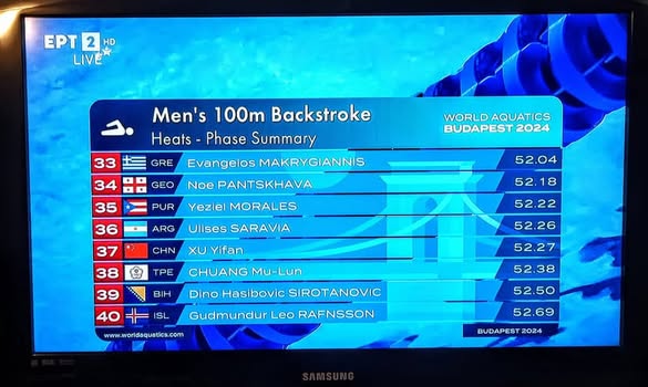 100 μέτρα Ύπτιο Ανδρών: ΜΑΚΡΥΓΙΑΝΝΗΣ ΕΥΑΓΓΕΛΟΣ (Α.Ο.ΠΑΛΑΙΟΥ ΦΑΛΗΡΟΥ) με επίδοση 52.04 κατατάχθηκε στην 33η θέση. Το Πανελλήνιο Ρεκόρ Ανδρών ανήκει στον ΧΡΗΣΤΟΥ ΑΠΟΣΤΟΛΟ με 49.66 από τις 13/12/2022.