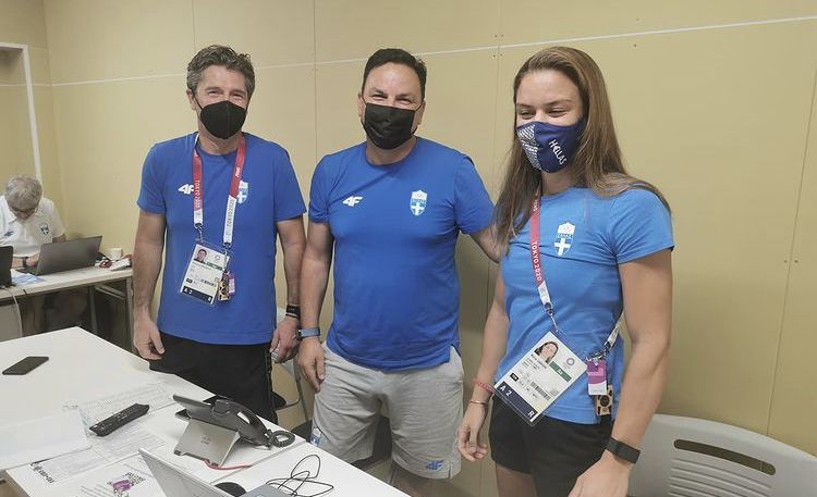 Οι δύο τεχνικοί ευχήθηκαν στην Μαρία και ο φακός της Εθνικής Ολυμπιακής Επιτροπής (ΕΟΕ) τους απαθανάτισε.