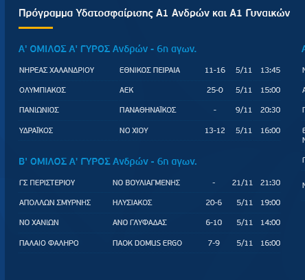 Ο Εθνικός κέρδισε εκτός έδρας τον Νηρέα Χαλανδρίου με 16-11 και ανέβηκε στην 4η θέση του Α' Ομίλου, ενώ ο Ολυμπιακός συνέχισε το σερί νικών χωρίς μάλιστα να δεχθεί γκολ κόντρα στην ΑΕΚ (25-0).