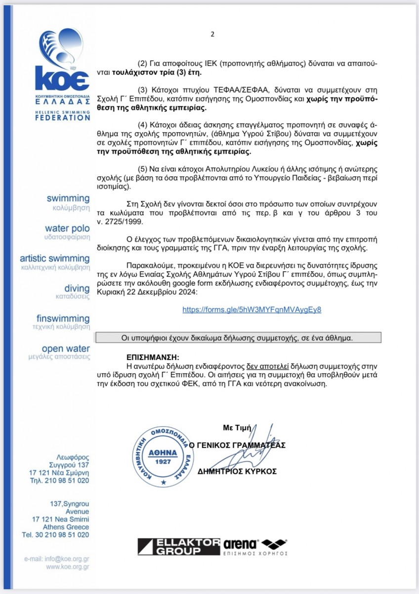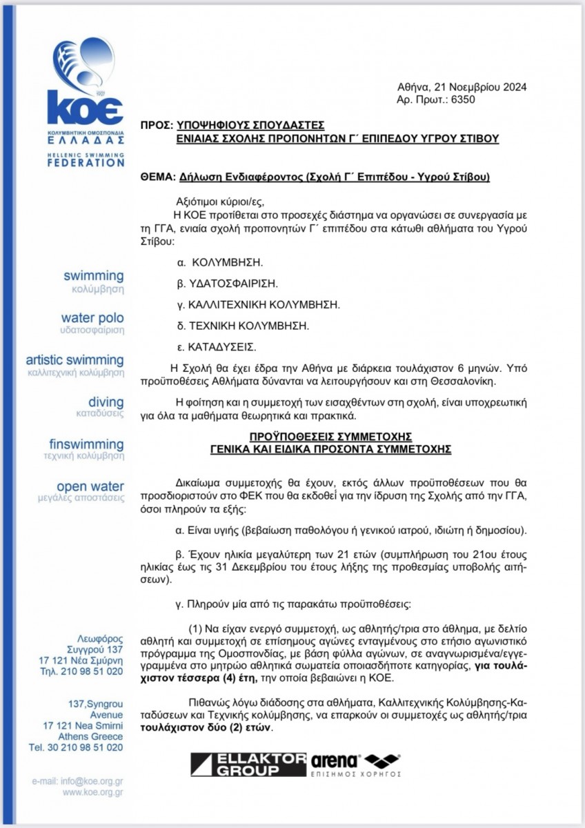 Η ΚΟΕ δημοσίευσε την εγκύκλιο για τη διοργάνωση, σε συνεργασία με τη ΓΓΑ, της Σχολής Προπονητών Γ' Επιπέδου για τα αθλήματα του Υγρού Στίβου και συγκεκριμένα την Κολύμβηση, την Υδατοσφαίριση, την Καλλιτεχνική Κολύμβηση, την Τεχνική Κολύμβηση και τις Καταδύσεις.