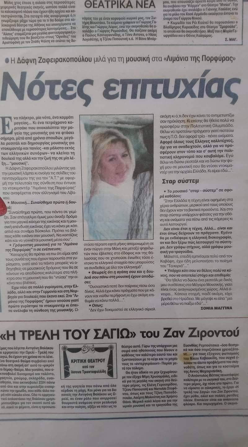 Η Δάφνη Λαιμού – Ζαφειρακοπούλου έχει μια κόρη, την Σοφία, 17 ετών και πρόκειται να παντρευτεί τον εκλεκτό της καρδιά της, ηθοποιό, Νίκο Ζιάγκο. « Ο Νίκος ….έβγαλε τα παπούτσια του και ….περπάτησε με τις μύτες των ποδιών του μέσα στο σπίτι μου. Σεβάστηκε όλη την οικογένειά μου, εμένα, το παιδί μου, τη μάνα μου. Καλός και σεβαστικός. Πρότυπο ηθικής ο μέλλων σύζυγός μου», καταλήγει.